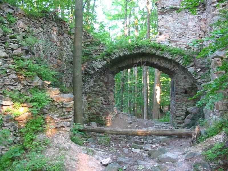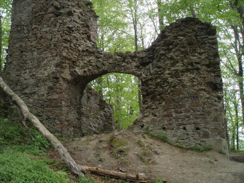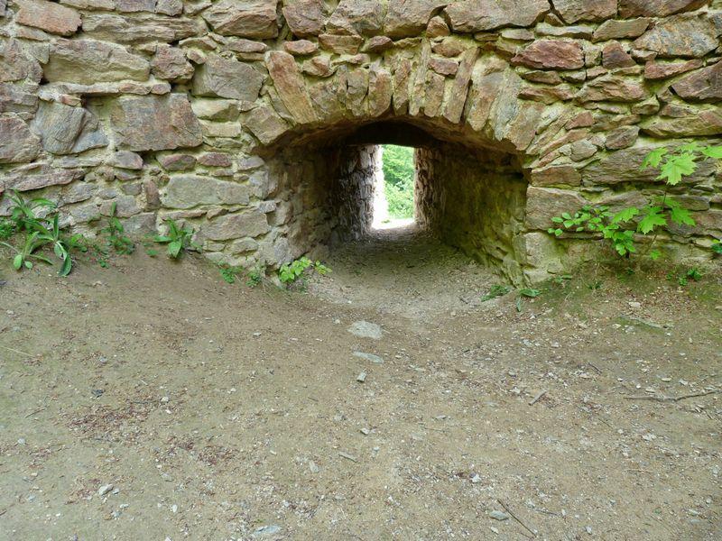 Starší brána umístěná v rozměrné branské věži, pohled zevnitř (levá špaleta brány se rozšiřuje, pravá je kupodivu přímá, pokud tedy nejde o výsledek novodobých úprav)