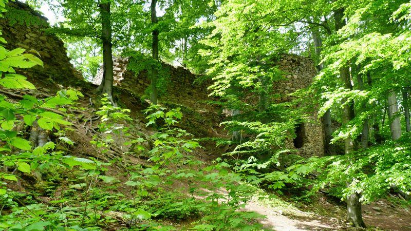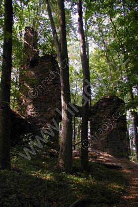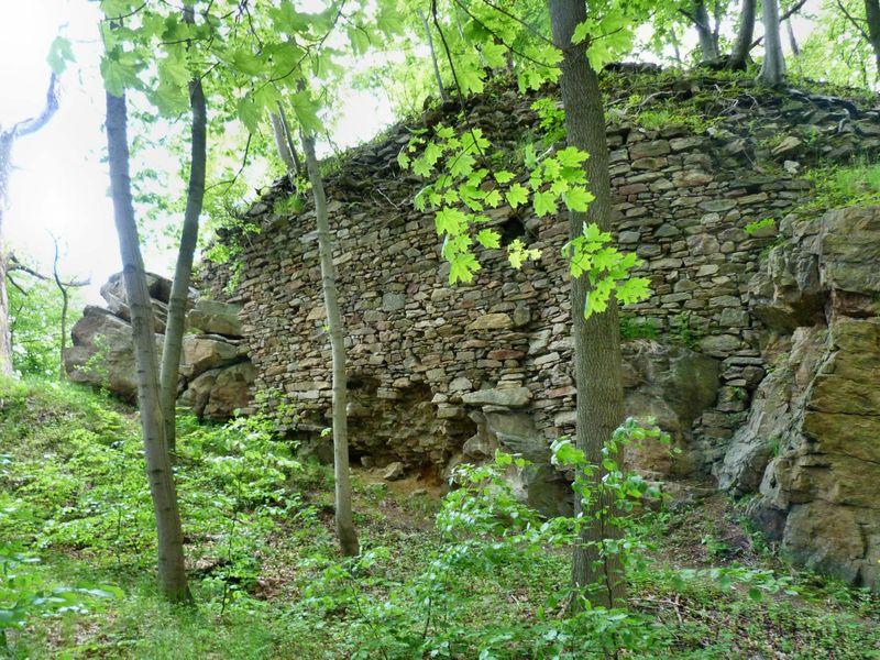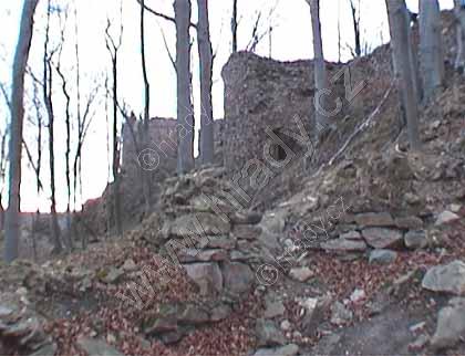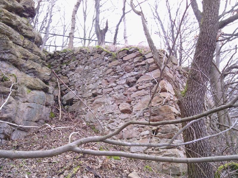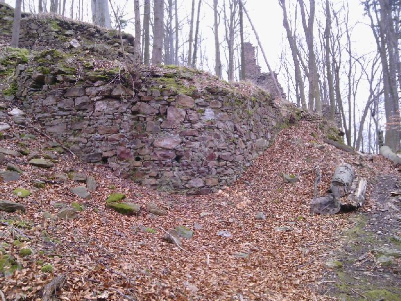 Vyzděné rozšíření základu (neznámé) budovy do svahu na JZ jádra hradu