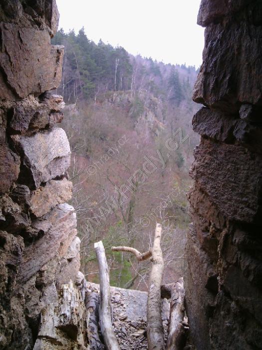 Průhled hlubokou střílnou již. bašty, je vidět, že cíleně mířila na skalnatý útvar v sousedství