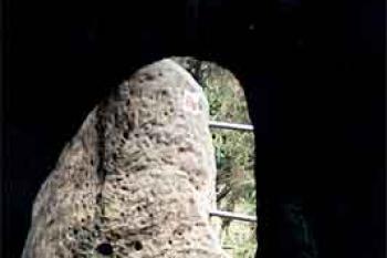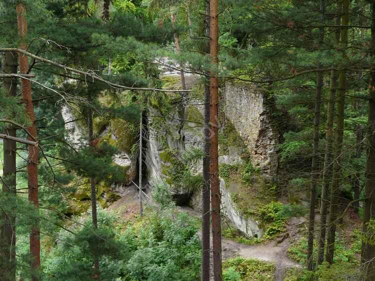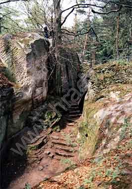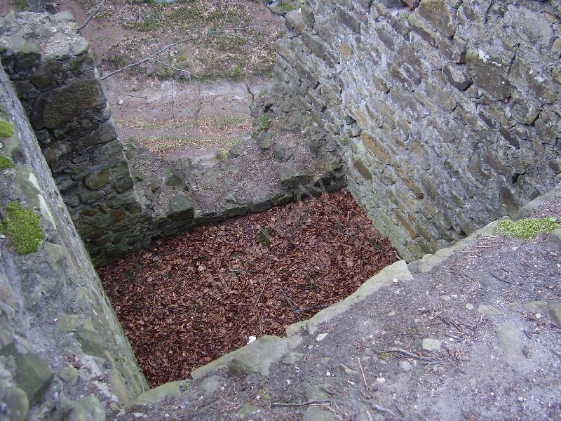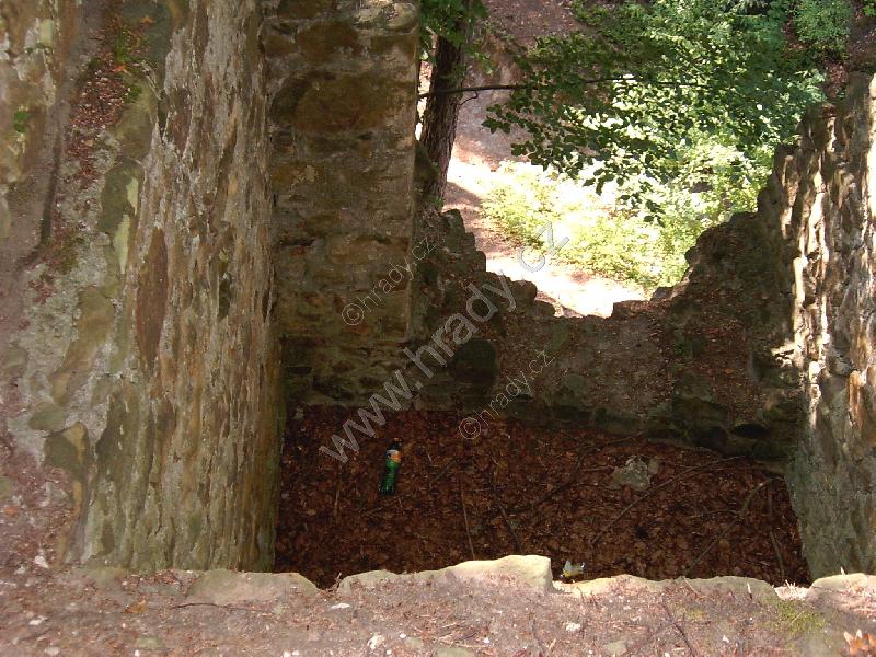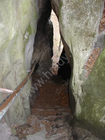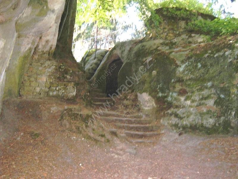 Vstup vznikl sesutím hradeb na této straně, původní vstup je skalní průrvou od východu
