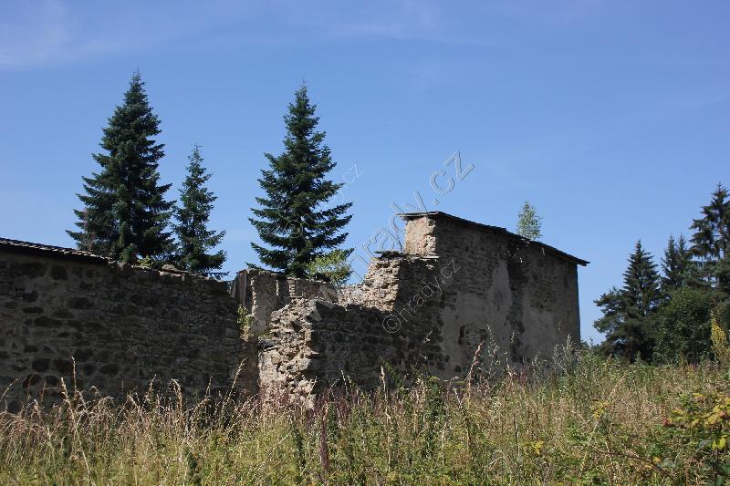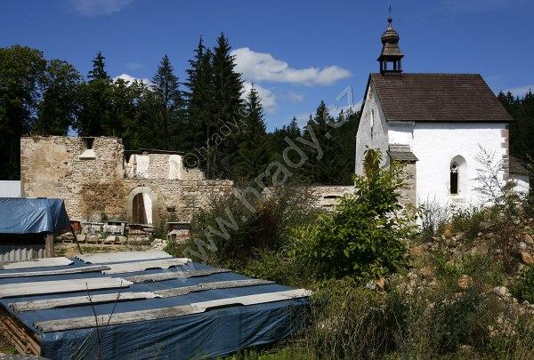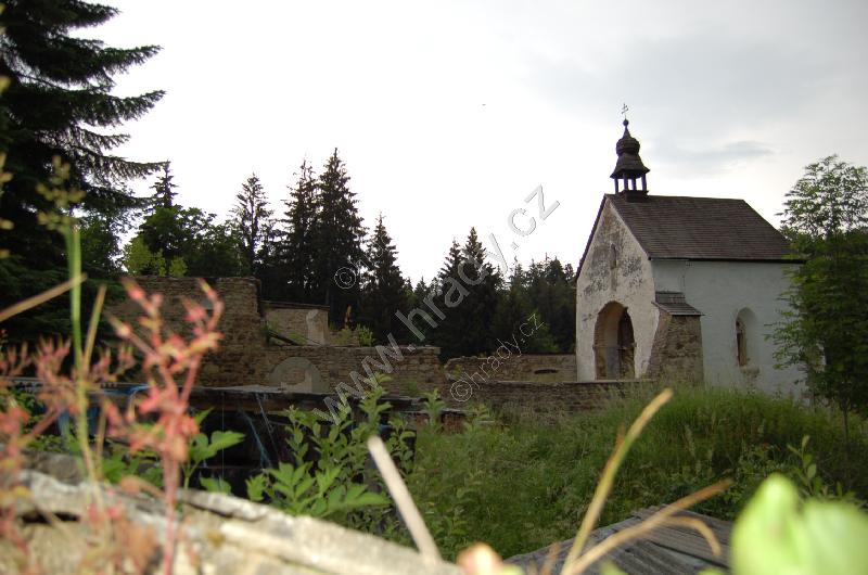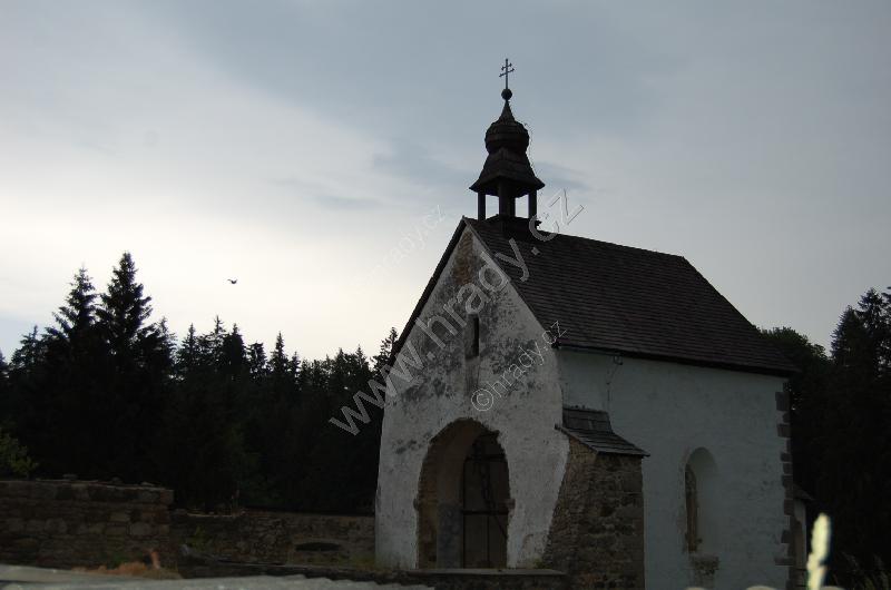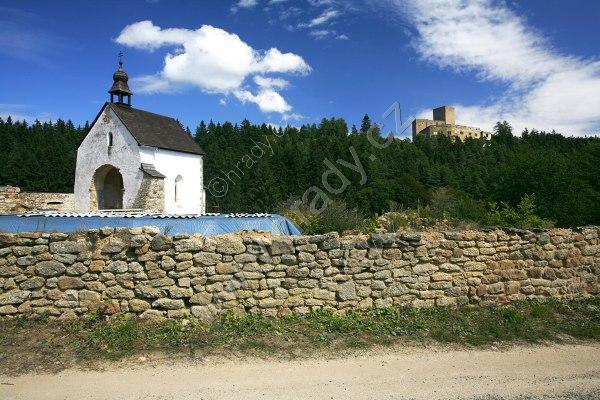 Areál původního hradu je obklopen mladší zdí. Je odtud také pěkně vidět Landštejn.