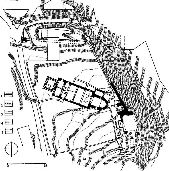 1) románské zdivo; 2) gotické zdivo; 3) novověké zdivo; 4) archeologické sondy; 5) zaniklá cesta