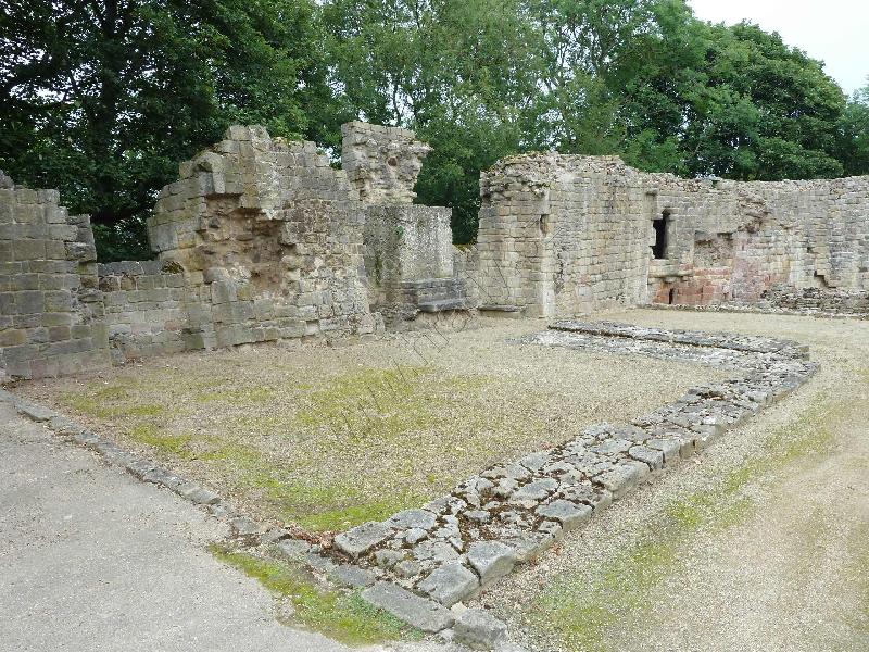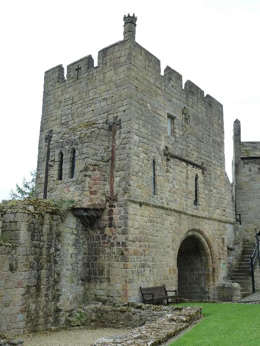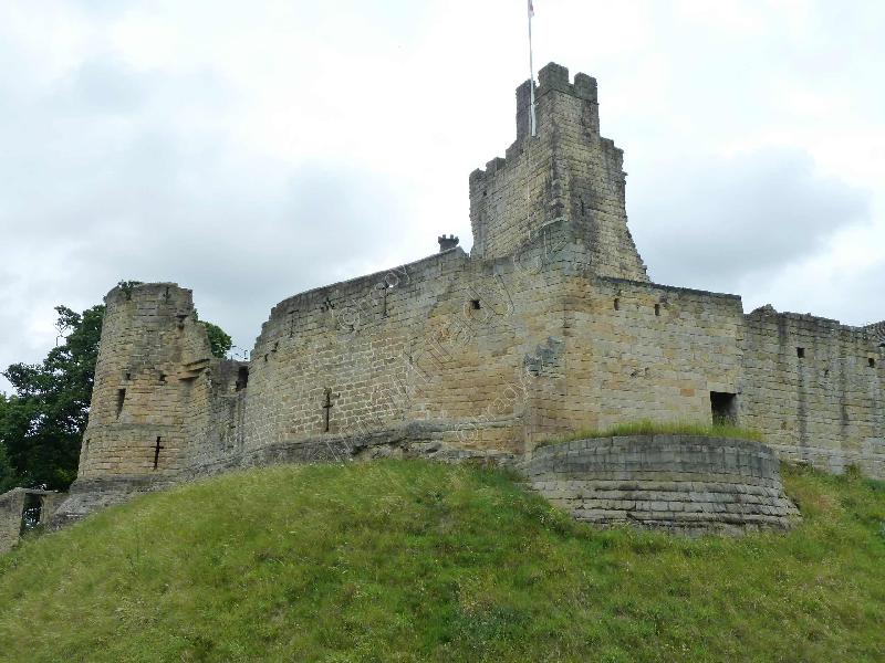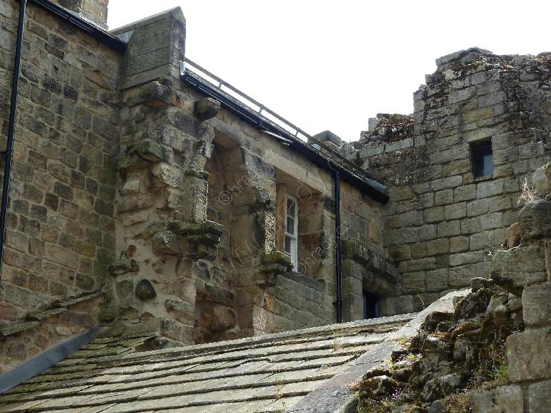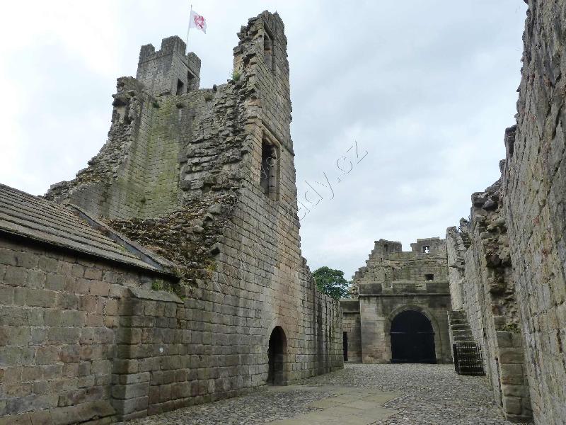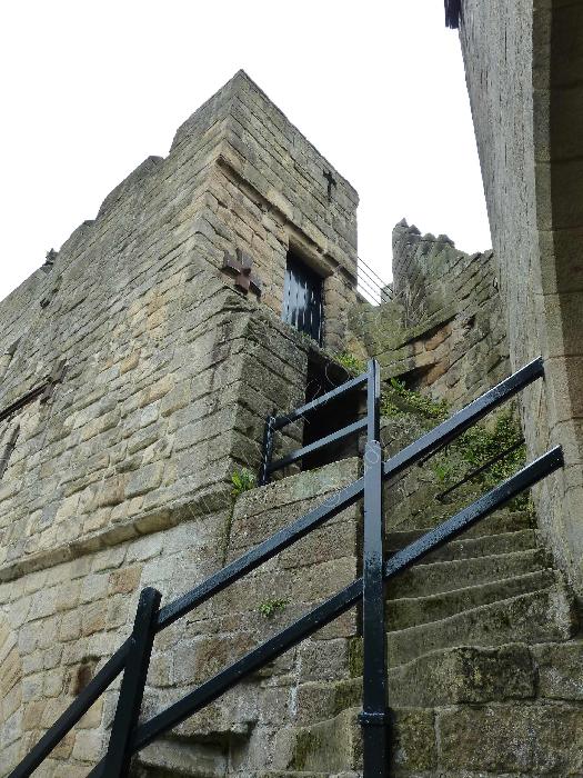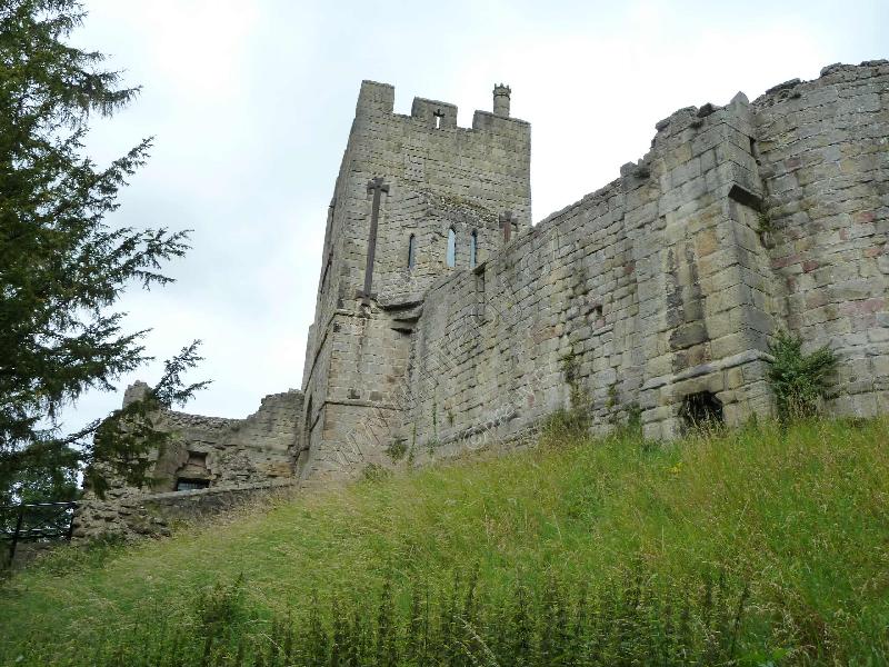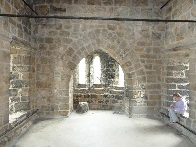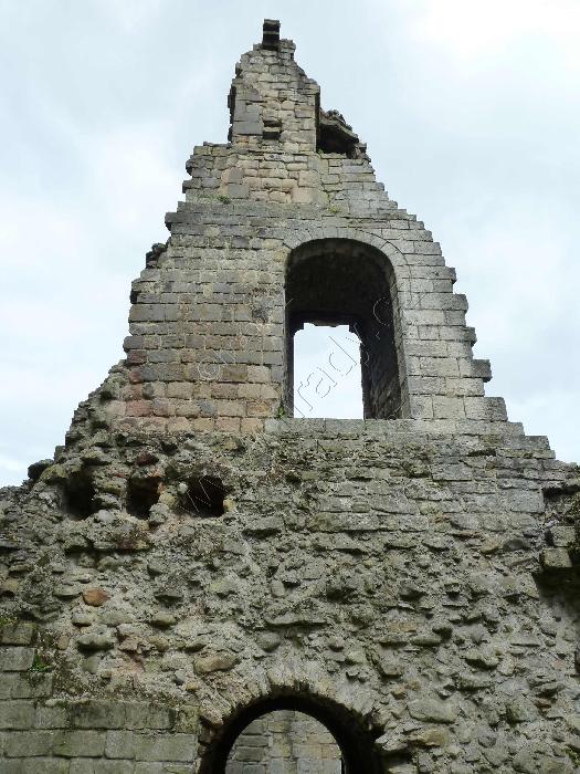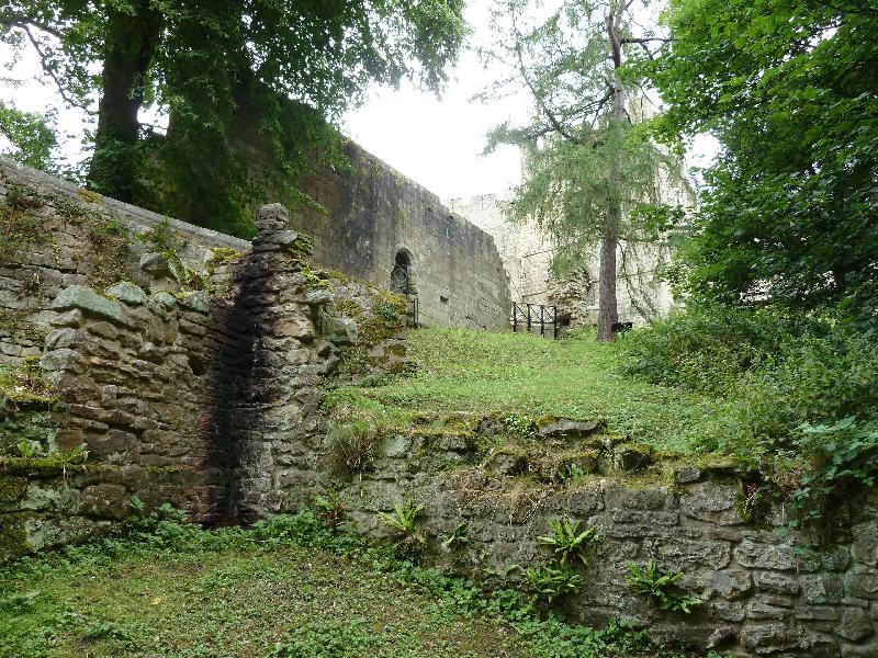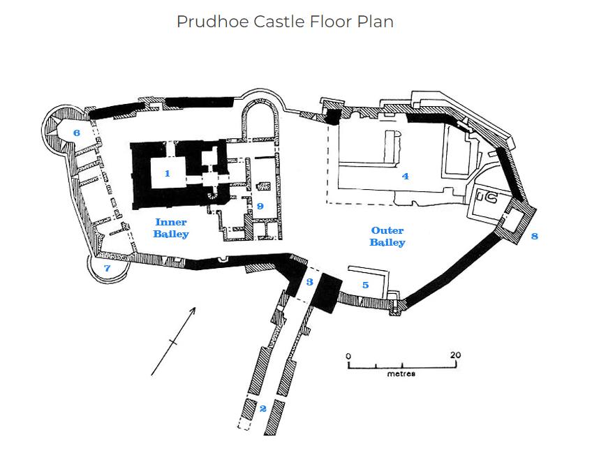 Půdorys jádra hradu a druhého předhradí. Černé zdivo ze 12. stol., šrafované ze 14. a 15. stol., tečkované z 19. stol. Číselné označení: 1. donjon, 2. předbraní, 3. románská branská věž, 4. velký sál, 5. obytné stavení, 6.-7. flankovací věže, 8. východní věž 2. předhradí, 9. panský dům