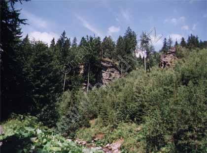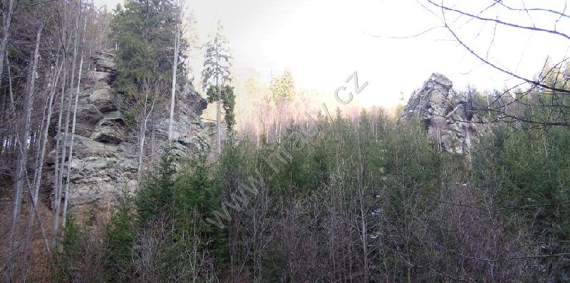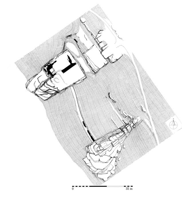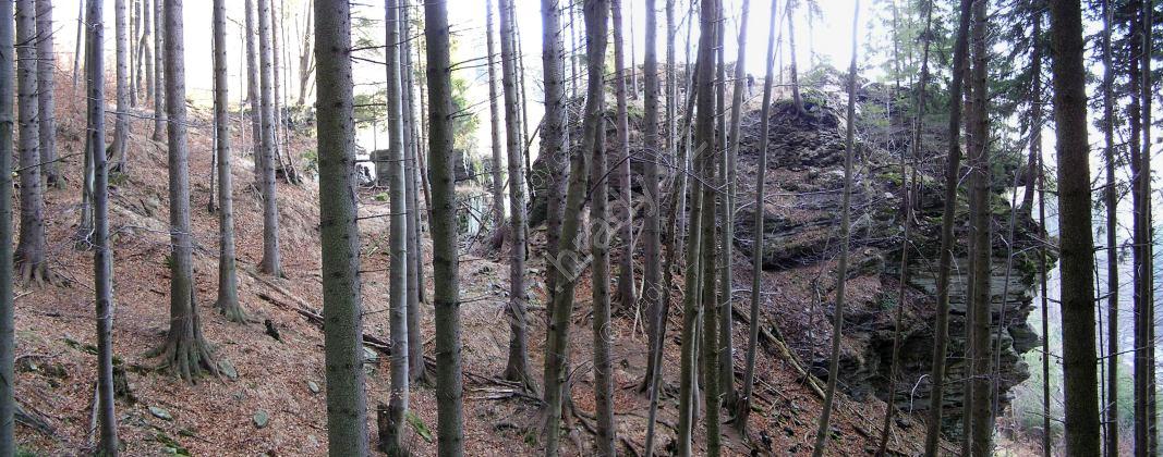 vlevo skaliska s hradem, pravo nevyužitá skála mezi níž a hradním skaliskem "snad" existovala nějaká využitá ohrazená plocha