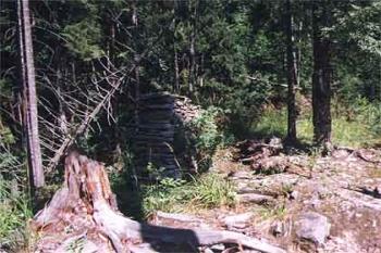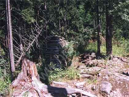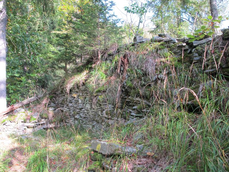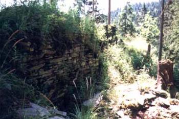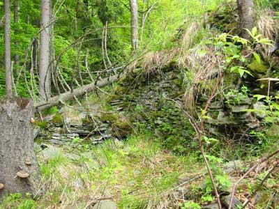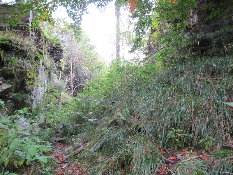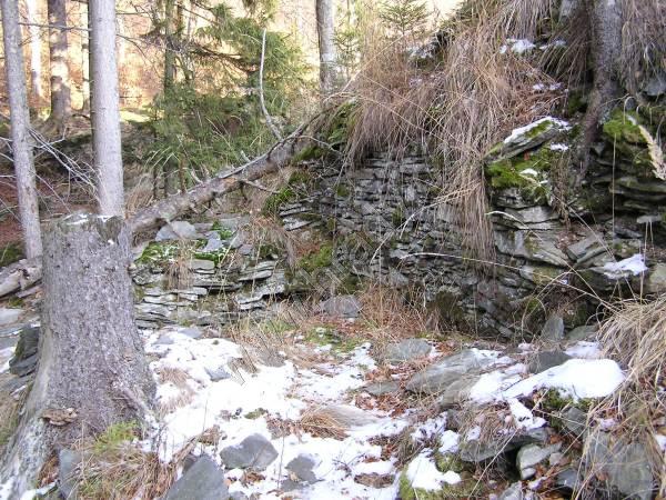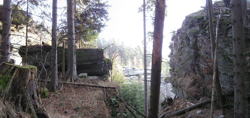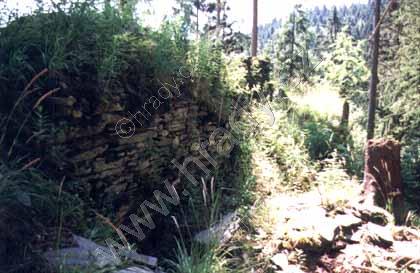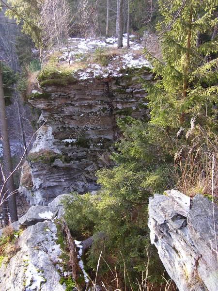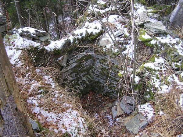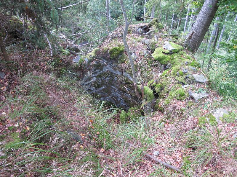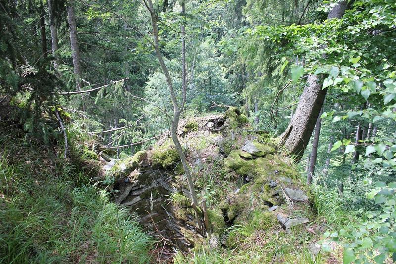 příkop /zřejmě z části vytesaný do skály vlevo/, přes nějž mohl hypotetický vést most na vlastní hradní skalisko /vpravo/
