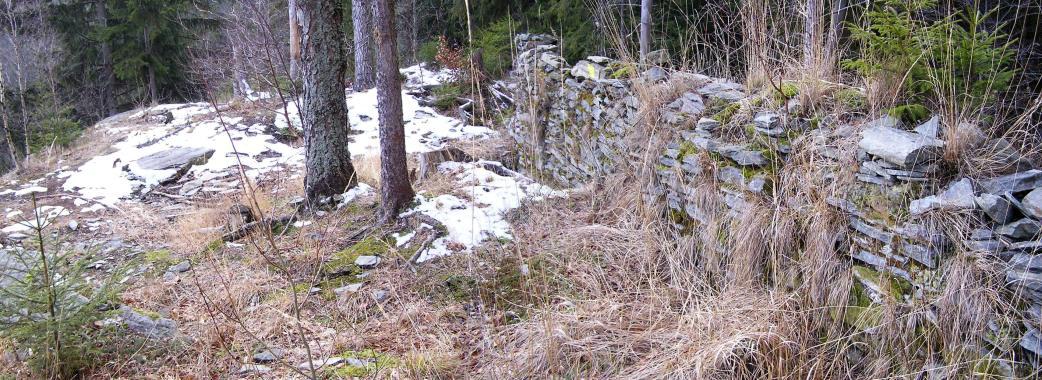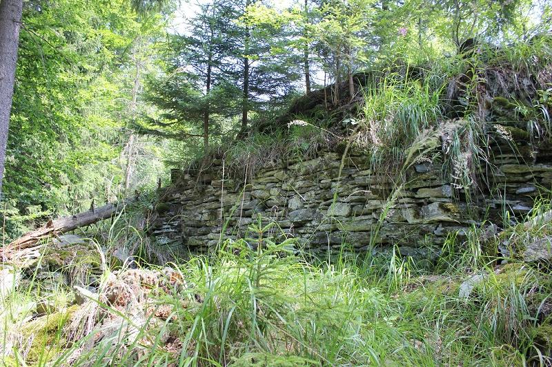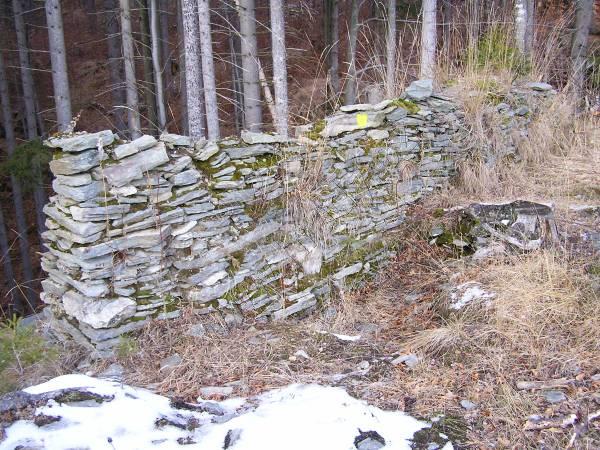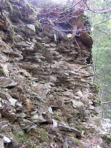 vlevo nástupní skalisko, následuje nížší skalisko, které sloužilo jako podepření dřevěného mostu, vpravo příkop a kolmá stěna hlavního skaliska, na kterém se rozkládal hrádek