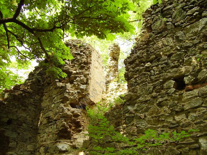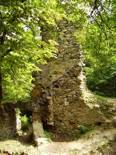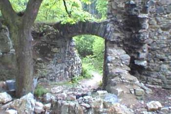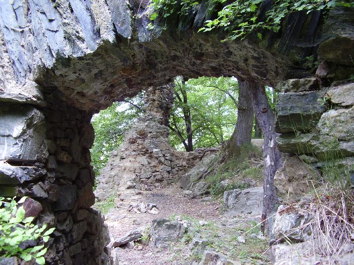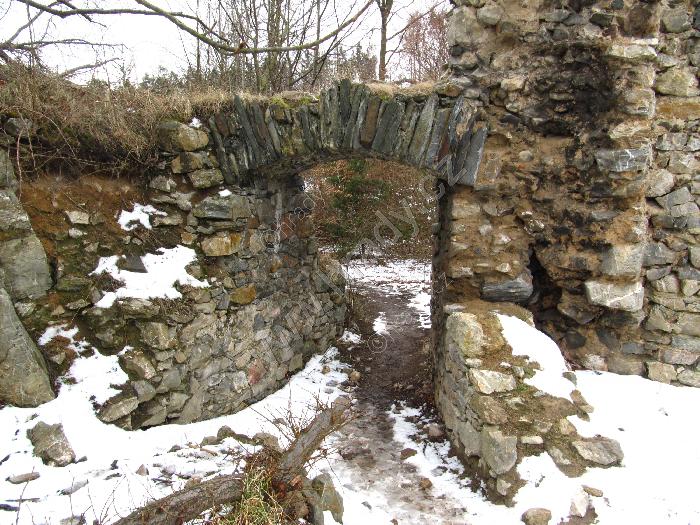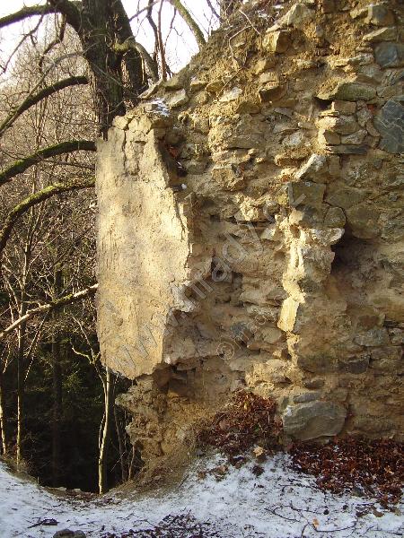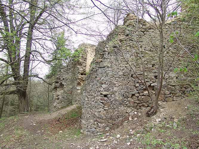 Vysoký střep obvodové hradby a branka do jádra hradu