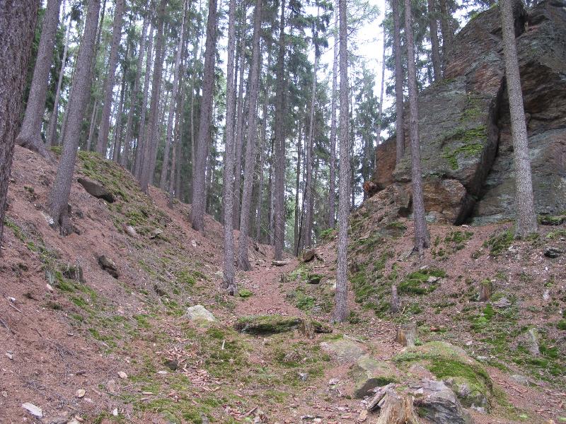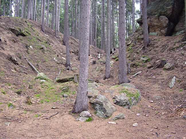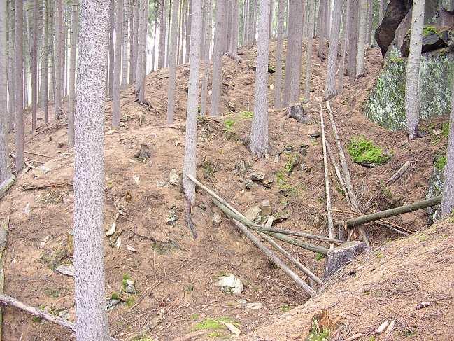 Sev. šíjový příkop. Vlevo val, vpravo předhradí