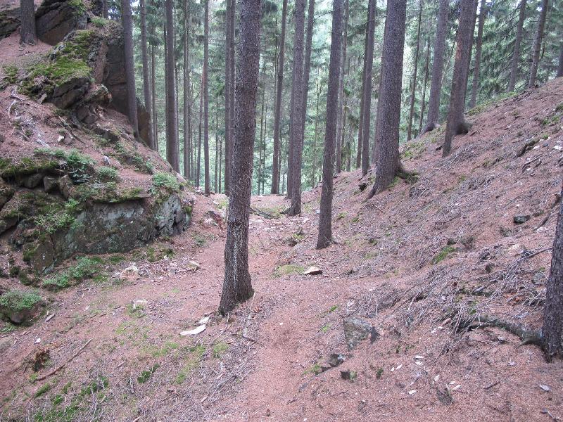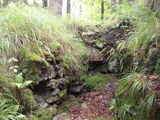 Příkop zčásti vysekaný ve skále v čele předhradí.
