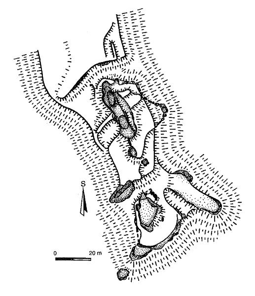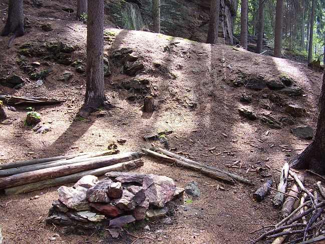 Vyvýšenina se zbytkem zdiva a tábořiště.