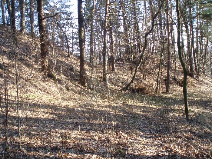 Pohled na příkop k východní straně, kde se rozšiřuje. Vpravo západní val s příkopem a hradní kopec (skála).