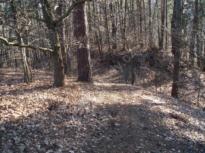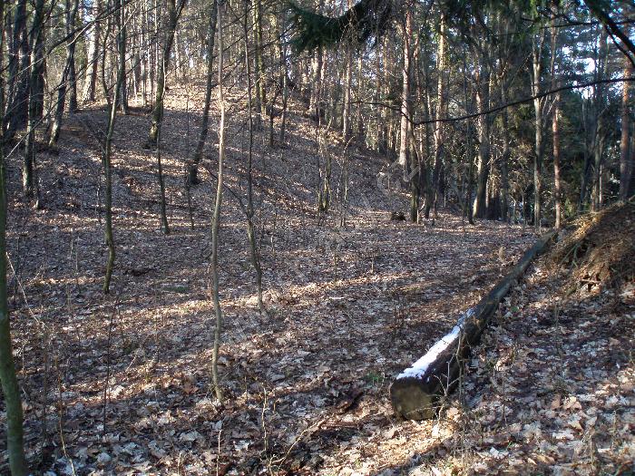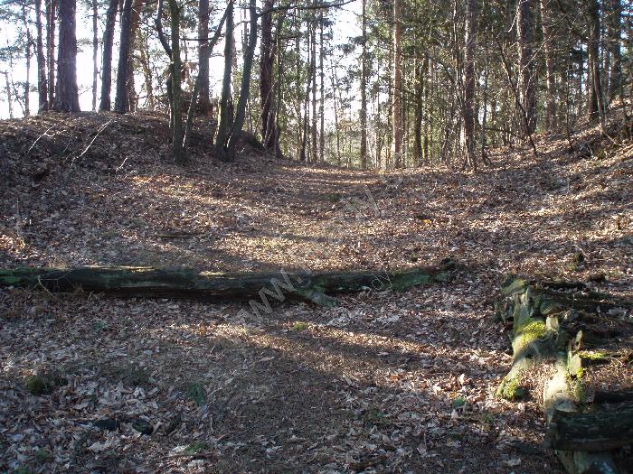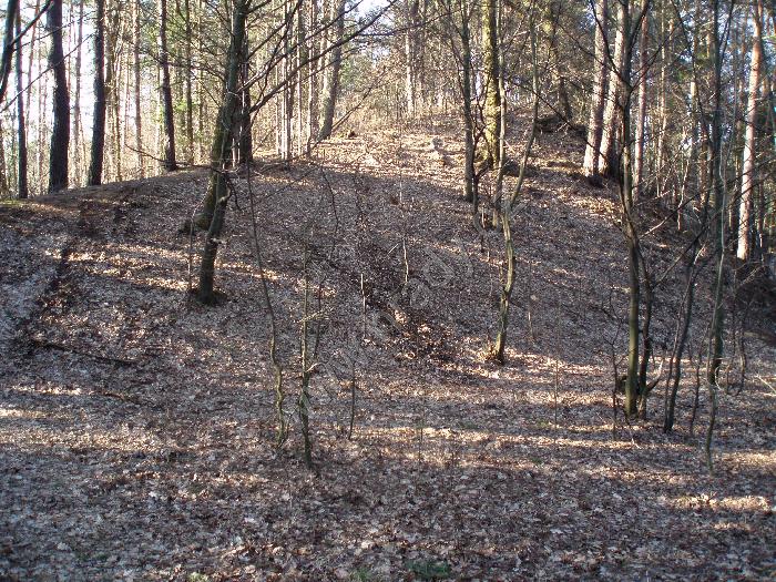 Pohled na západní příkop a val, vlevo část hradního kopce.