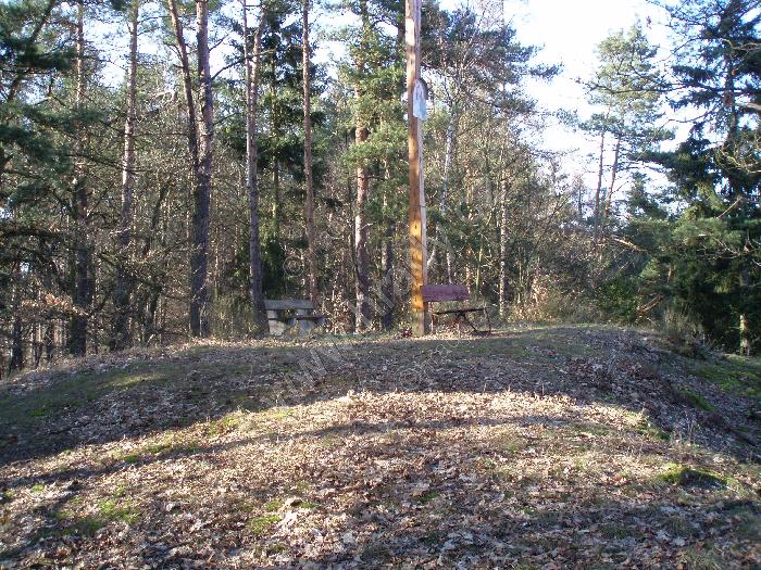 Jádro hradu, na kterém je vysoký kříž a lavička s výhledem k Letohradu.