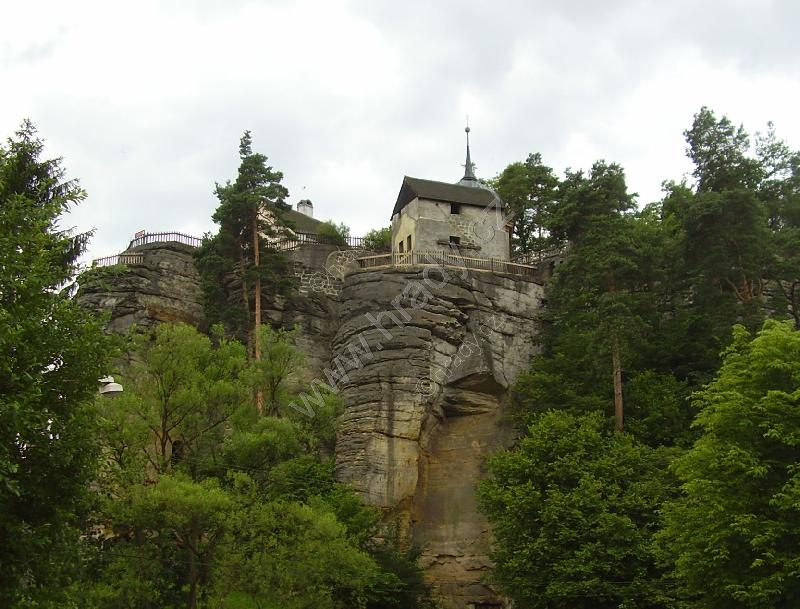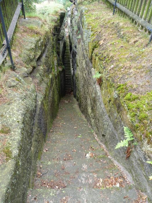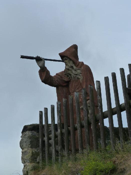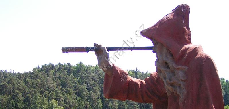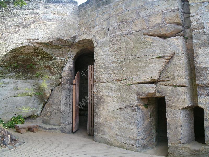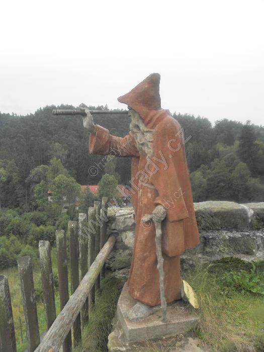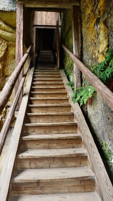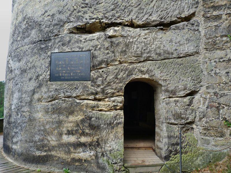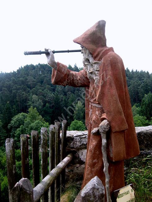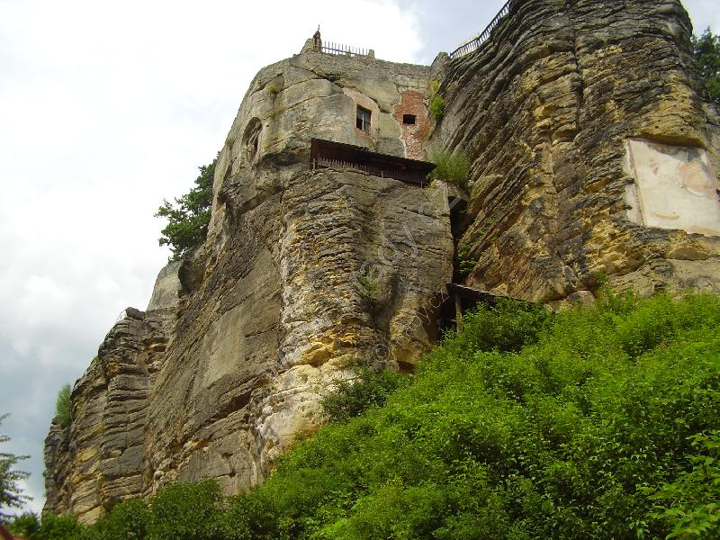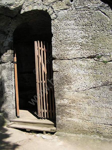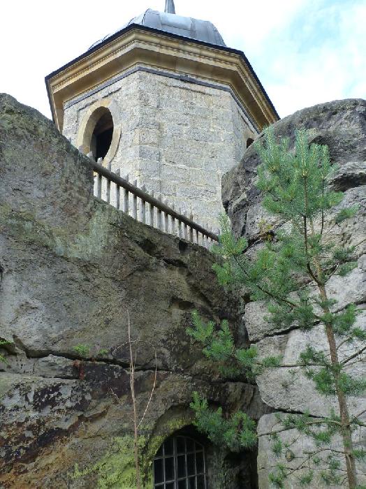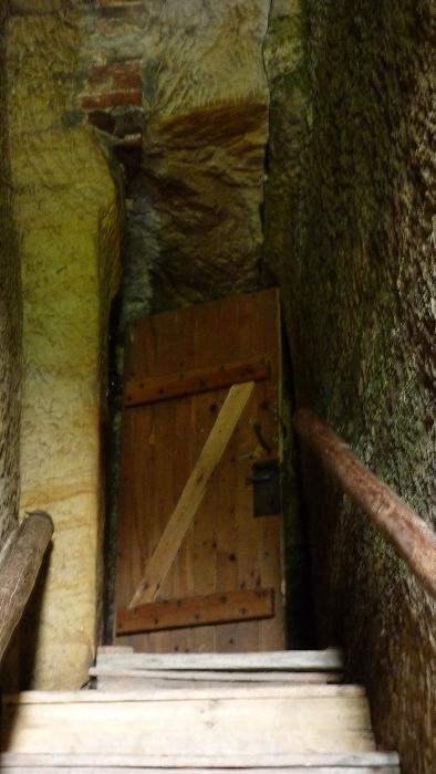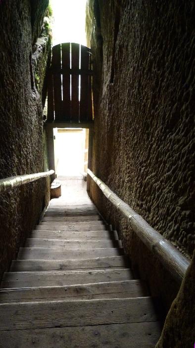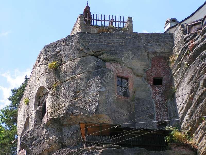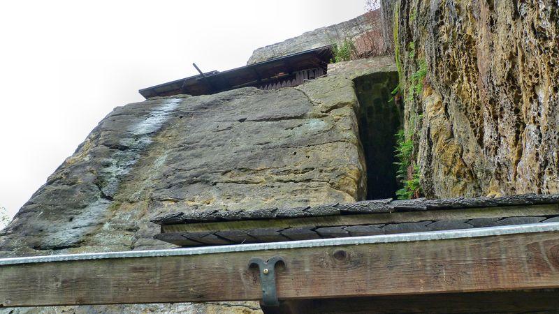 Dřevěná stříška kryje dnešní vstup, resp. pokladnu – zazděná spára kryje novodobé schodiště. Nahoře na skále dalekohledem hledí socha poustevníka