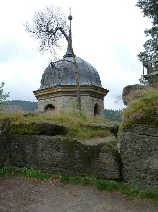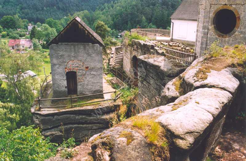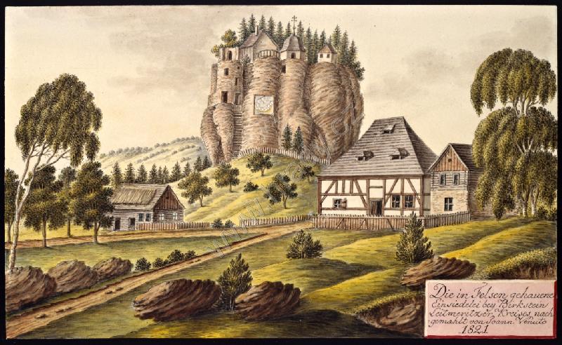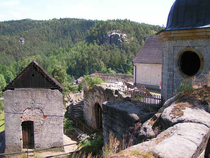 Z leva: poustevnické obydlí, nad ním v lesích skalní útvar Samuelovy poustevny, na pravo zakončení ve skále tesané prostory kostela z r. 1693