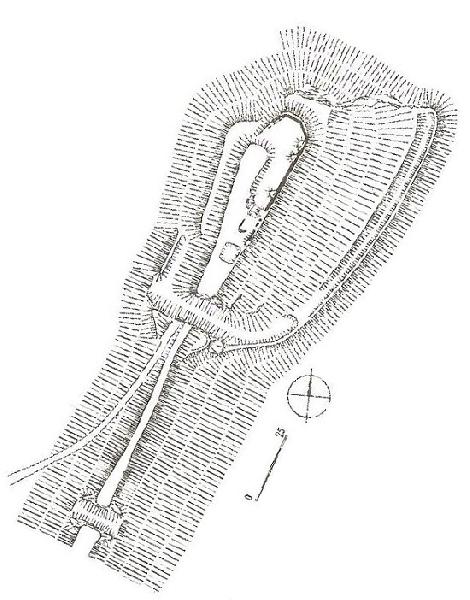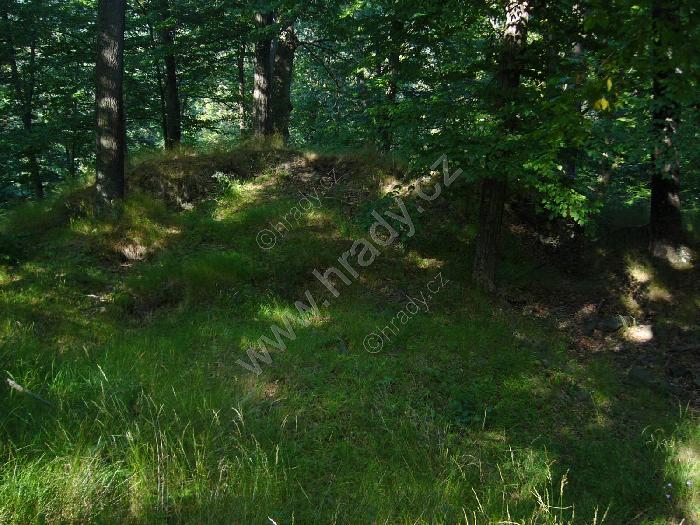 Pohled z jádra přes druhý příkop na úzkou šíji ostrožny