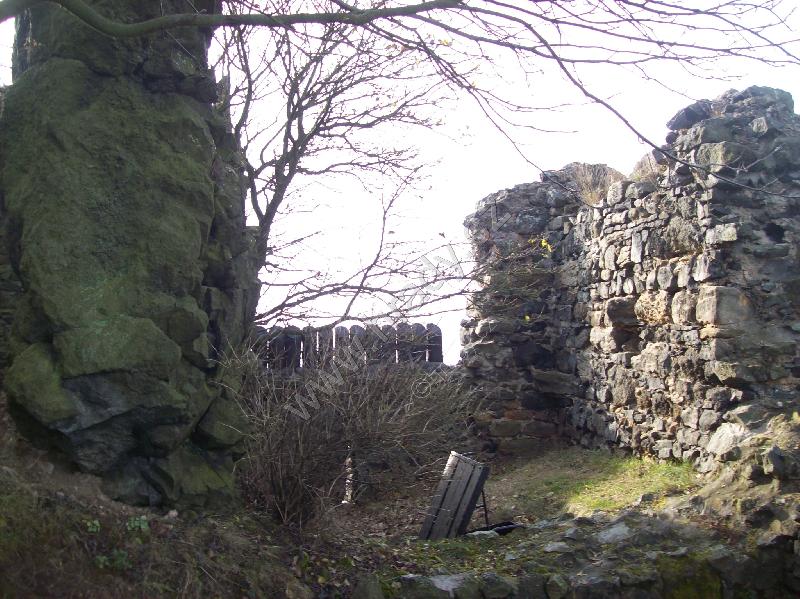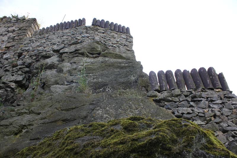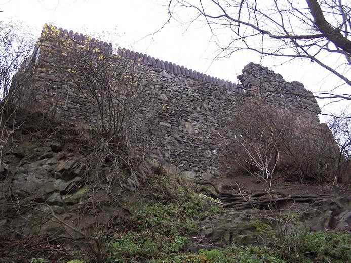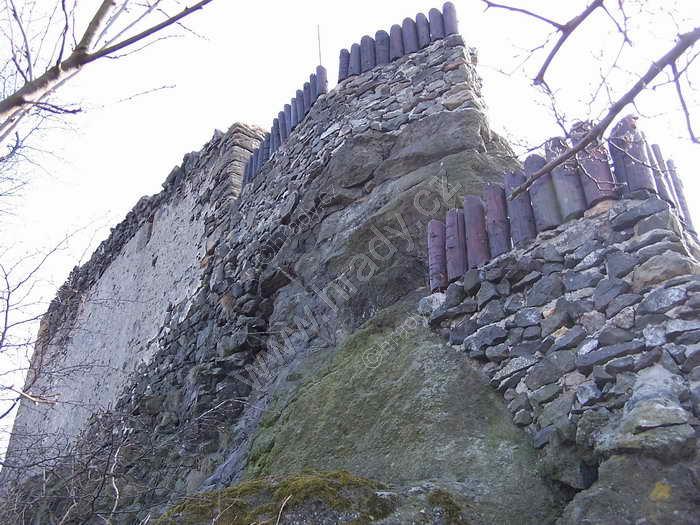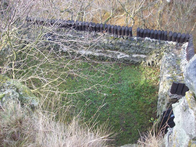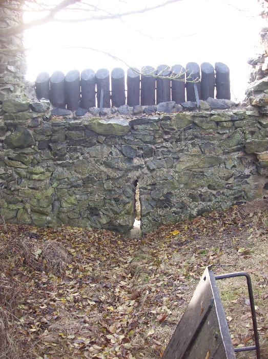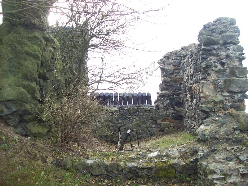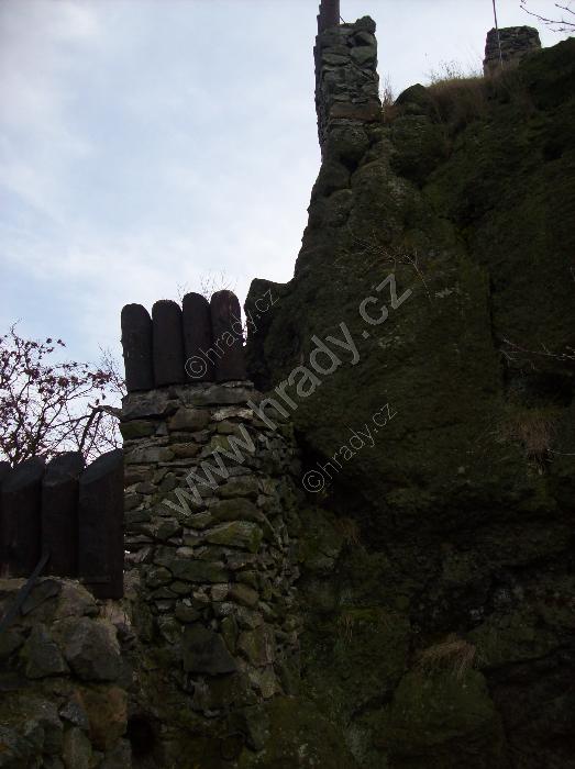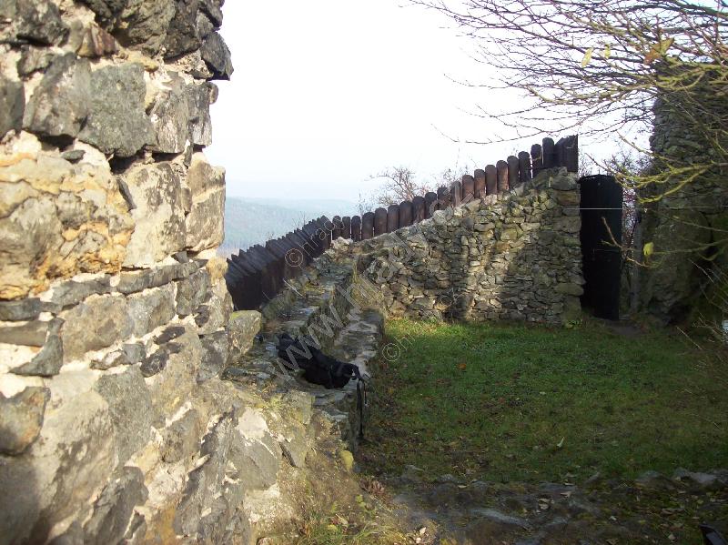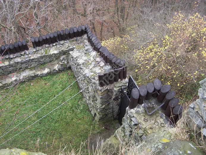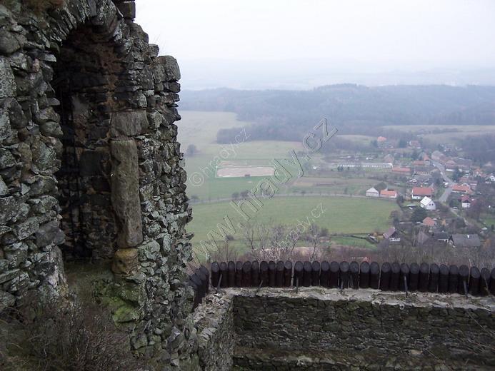 pohled ze střechy zříceniny na hradby s padacím můstkem