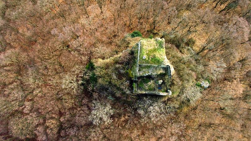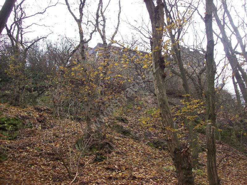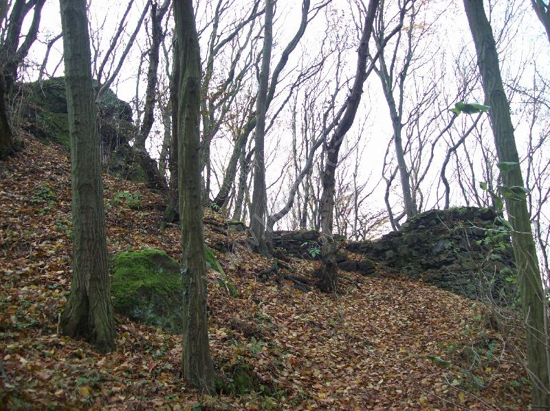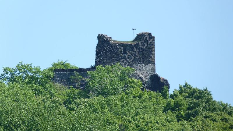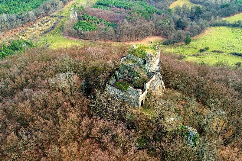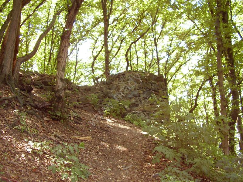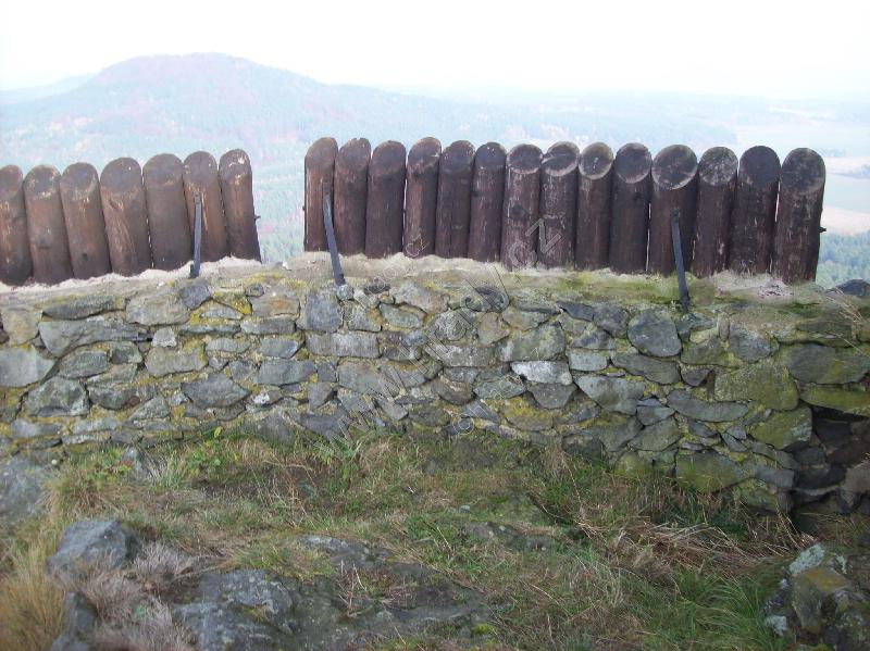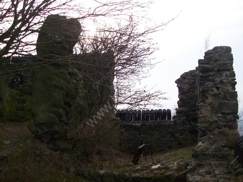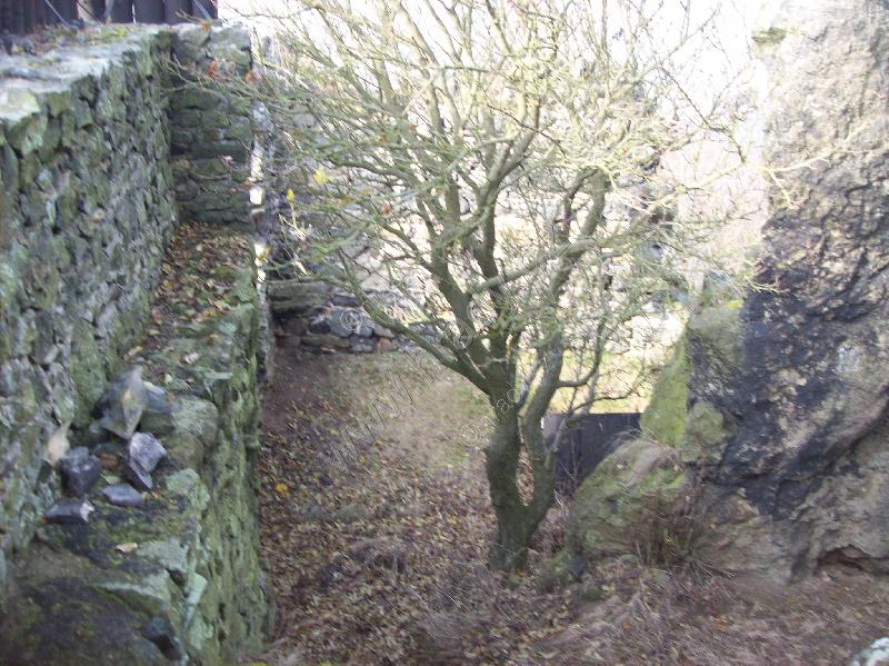 pohled ze střechy zříceniny na hradby s padacím můstkem