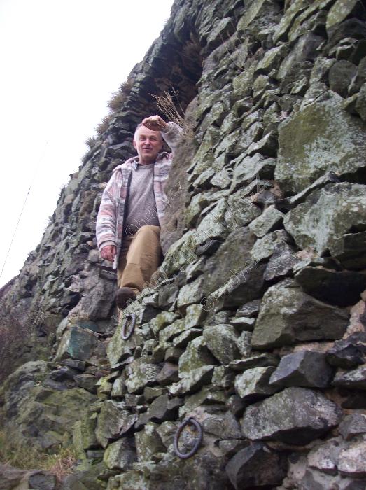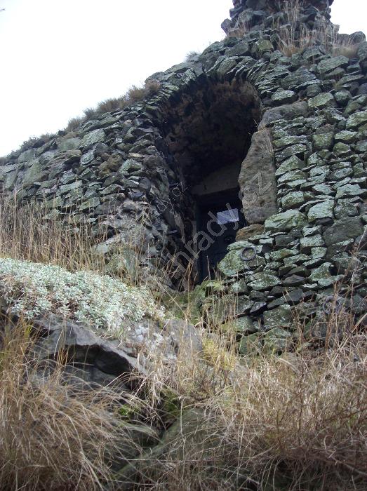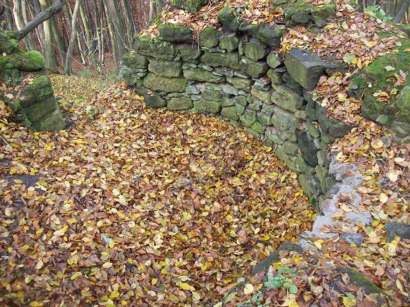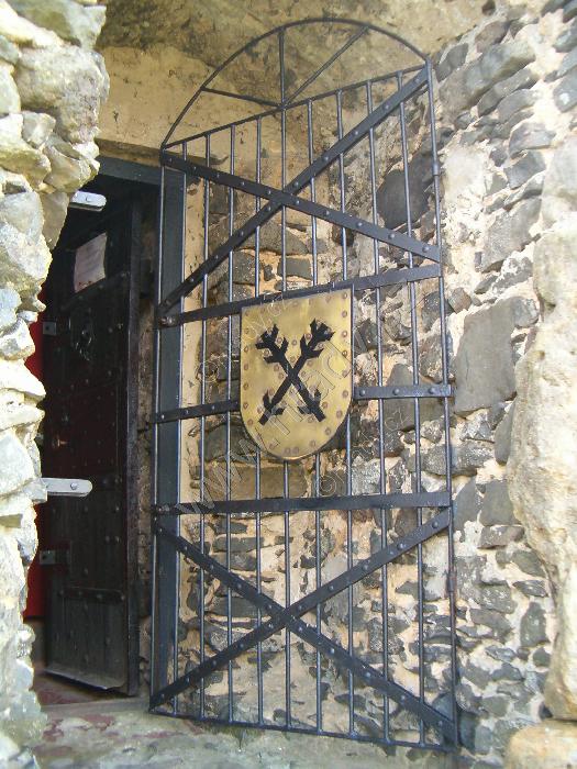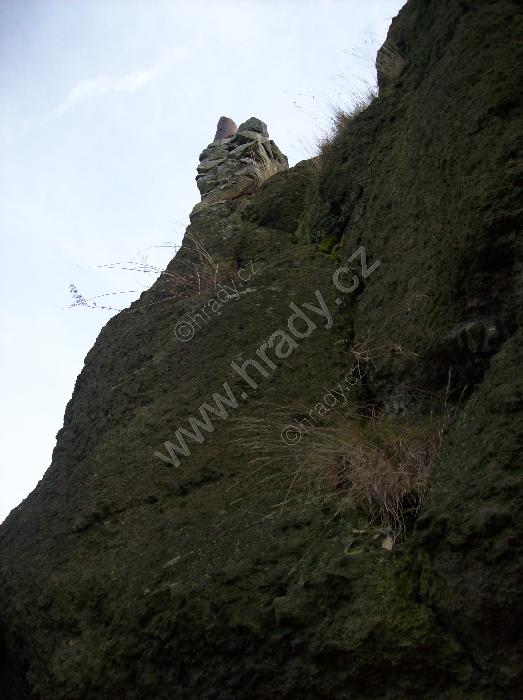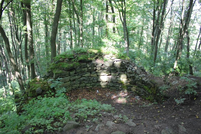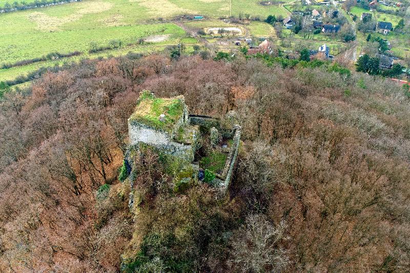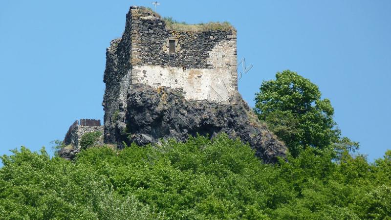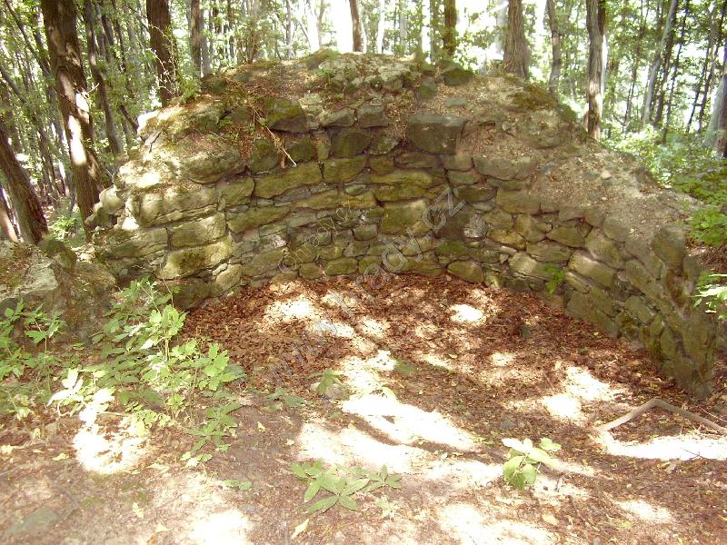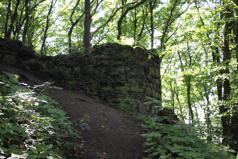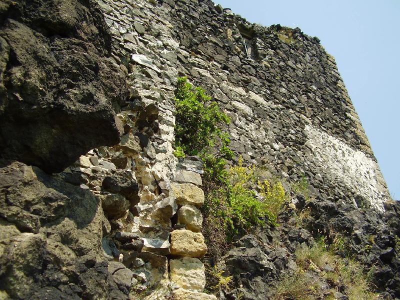 pohled ze střechy zříceniny na hradby s padacím můstkem