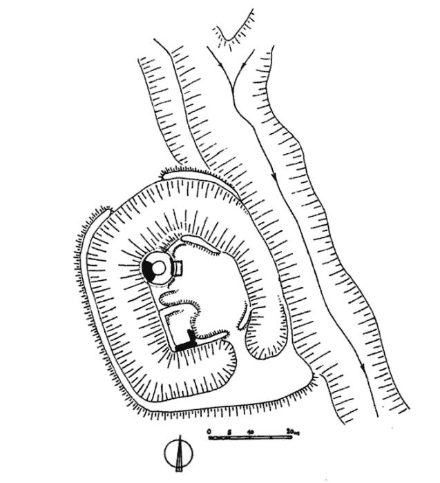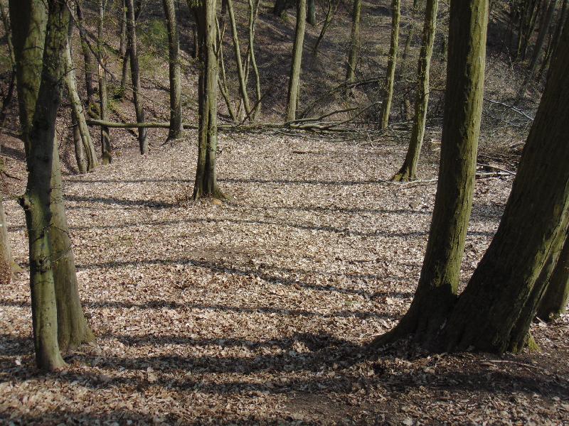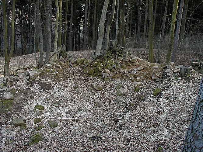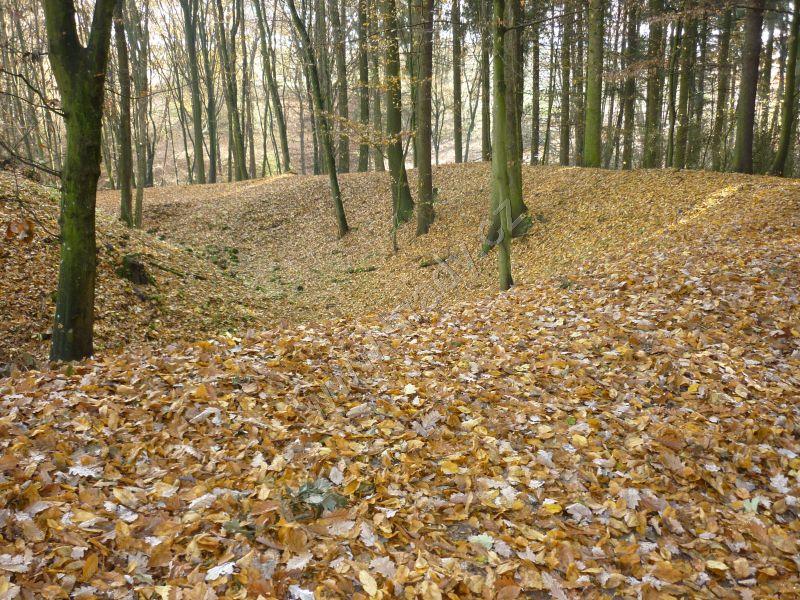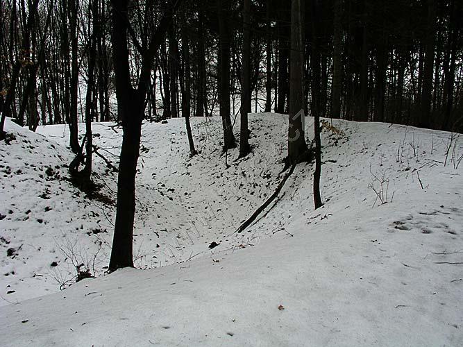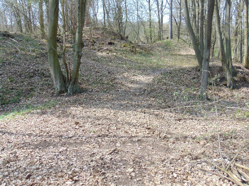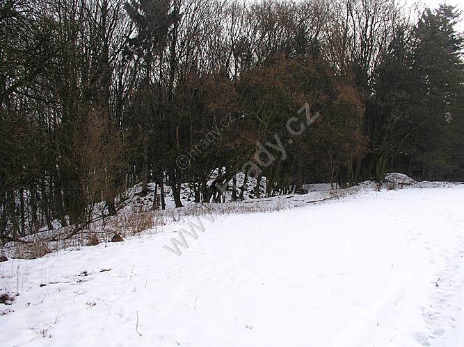 Příkop oddělující místo hrádku od předpolí. Pohled od jihu.