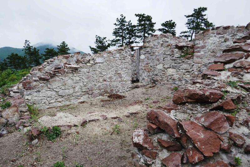 Pozůstatky obdélné věžové stavby v předhradí. Hradba na popředí dělila předhradí na dvě části.