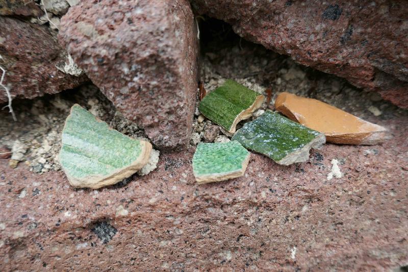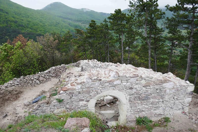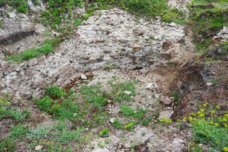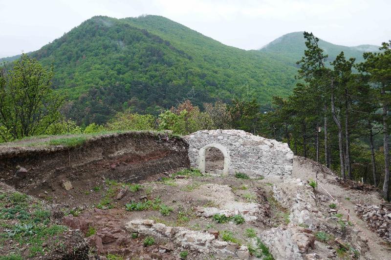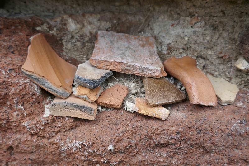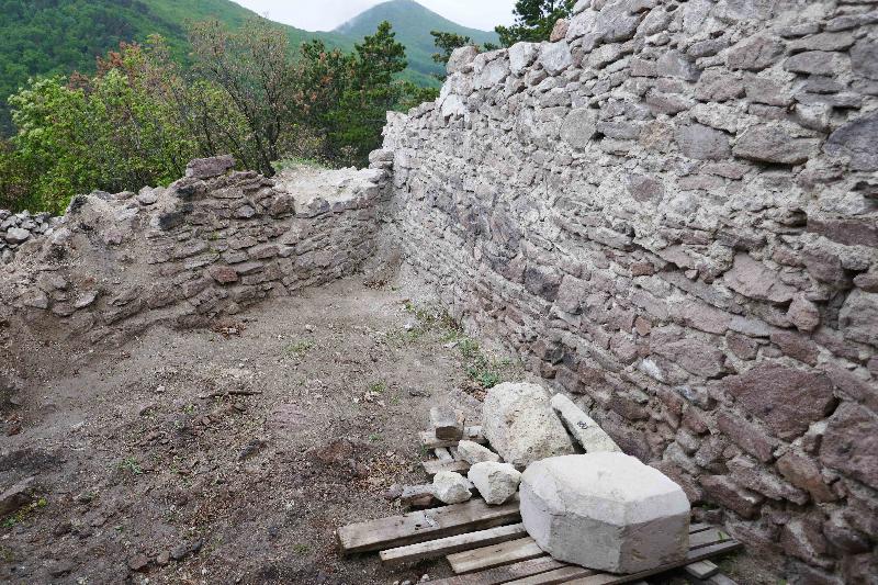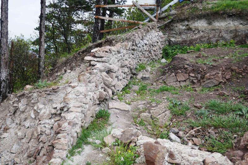Odkrytá zeď paláce. Na pozadí je prostor předhradí.