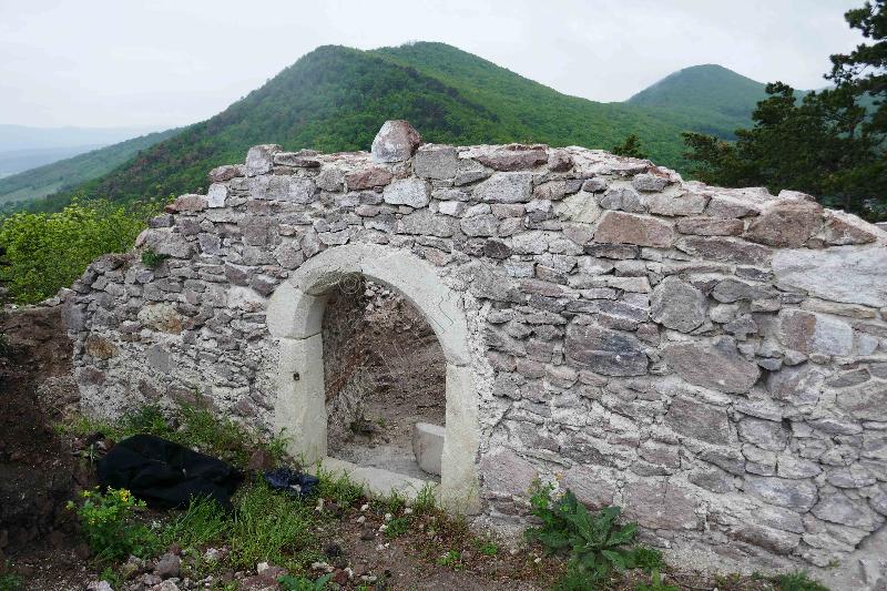 Trojúhelná věž v SZ čele předhradí. Na pozadí je kopec Sátor hegy (Stanová hora). Portál je celý původní.