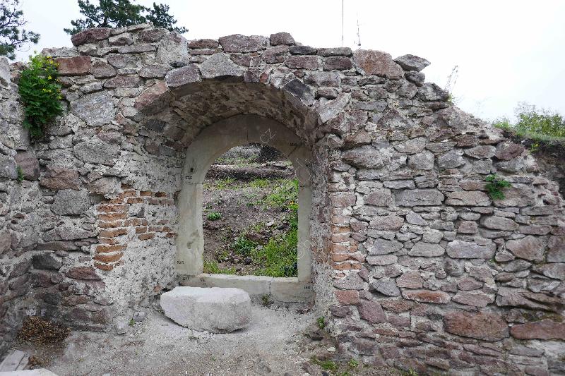 Pohled zevnitř na vstupní portál trojúhelné věže v SZ čele předhradí.