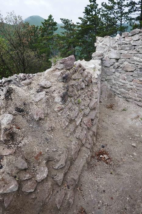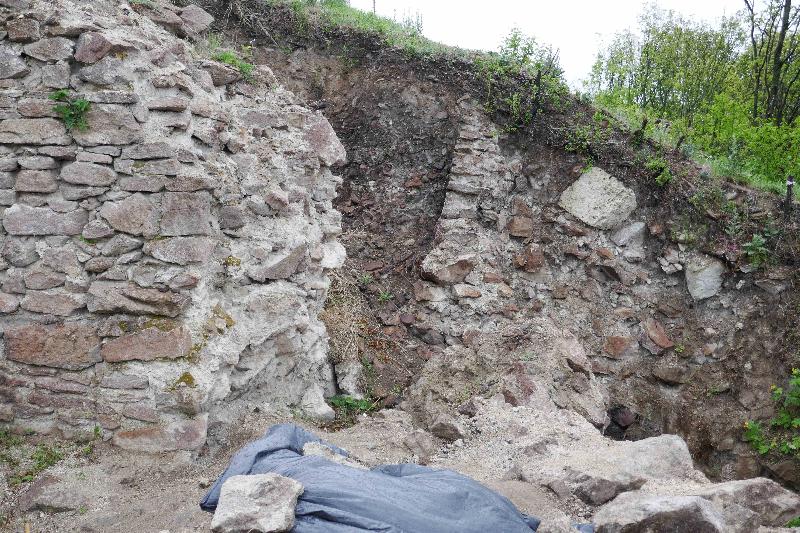 Místo kde se trojúhelná věž (nalevo) setkávala s hradbou předhradí (napravo).