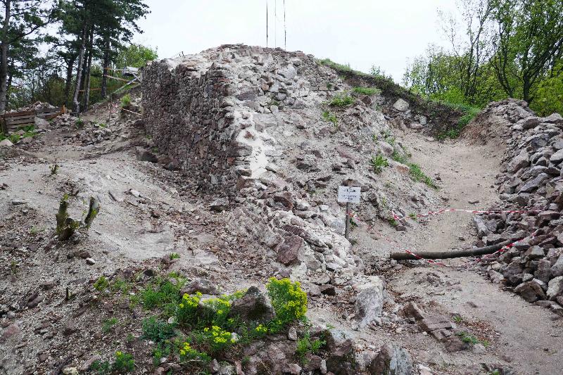Ohořelé trámy na suti zdiva svědčí o násilné destrukci a požáru trojúhelné věže.