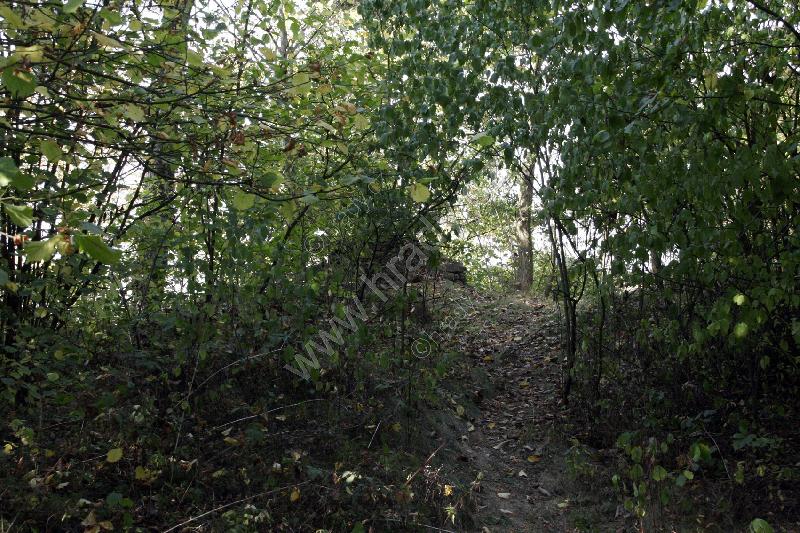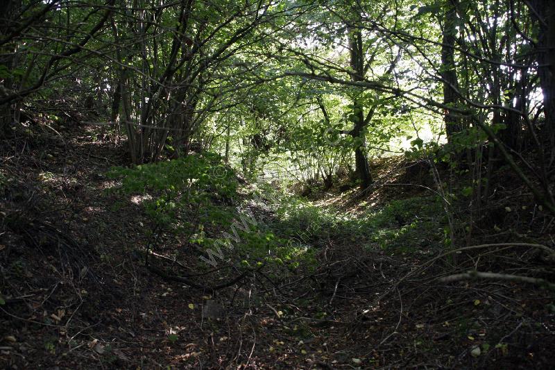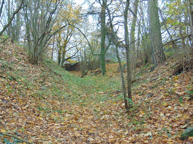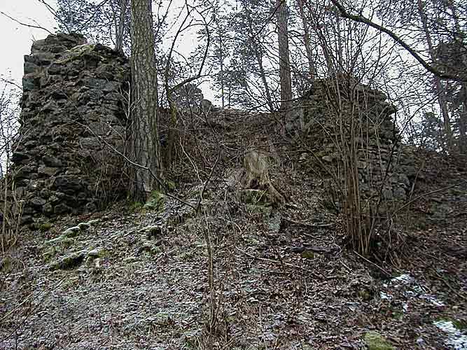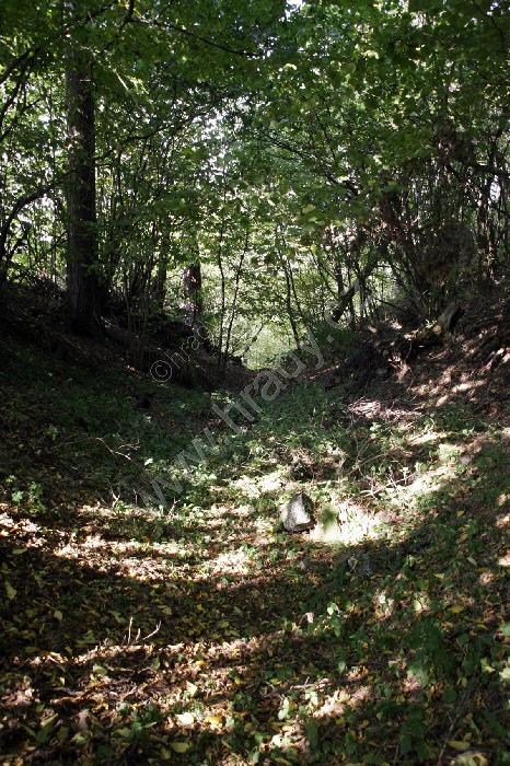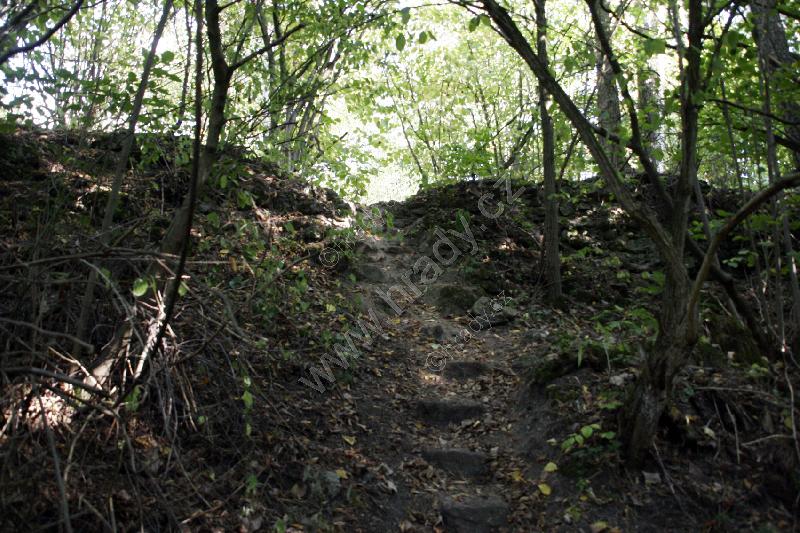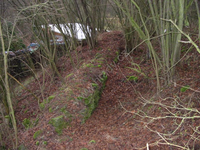 Mělký příkop na západě oddělující hrad /vlevo/ od přístupové plošiny
