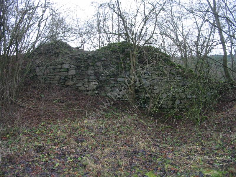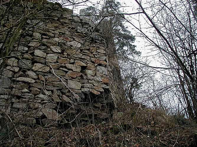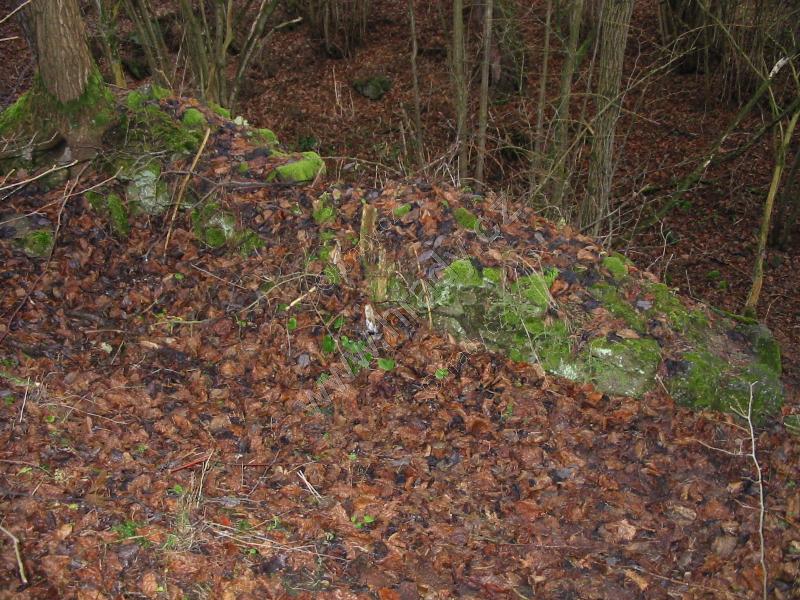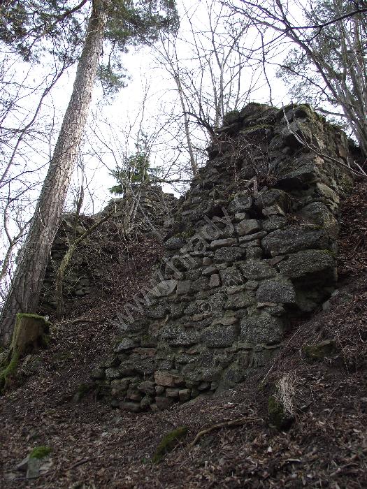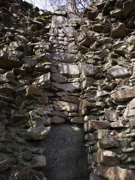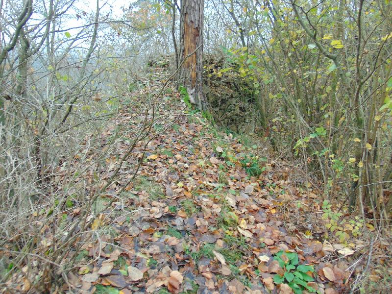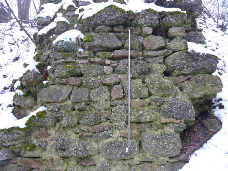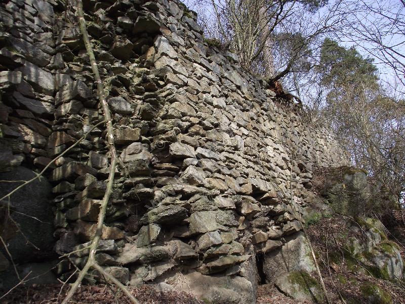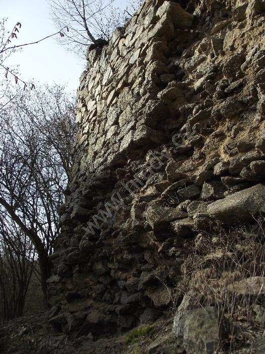 Úzký líc vnější hradby (pohled zvnějšku), který tvoří (tvořil) snad nějakou šachtu dosedající na skálu