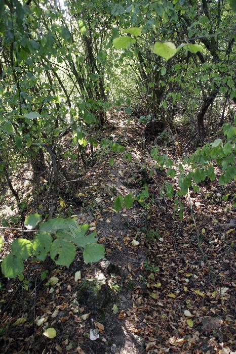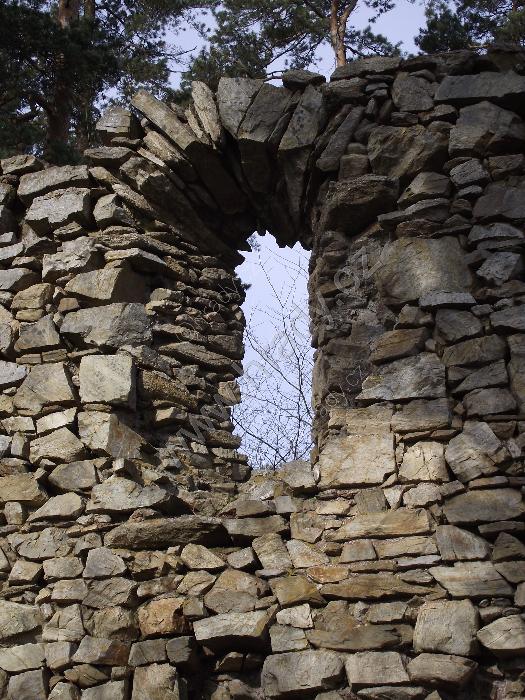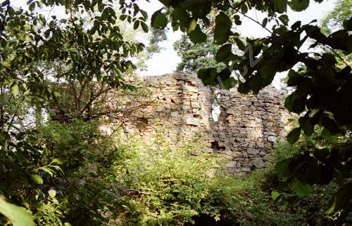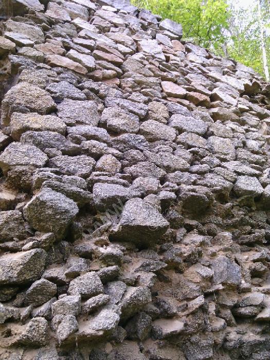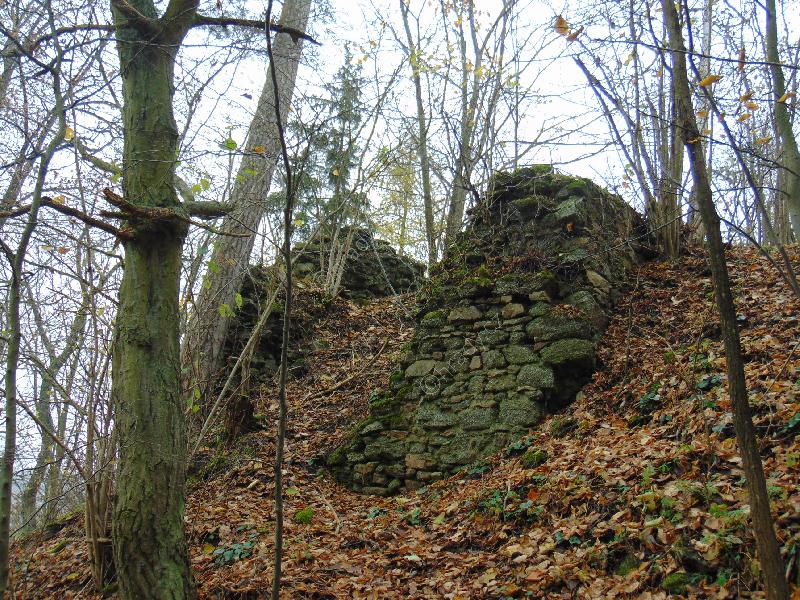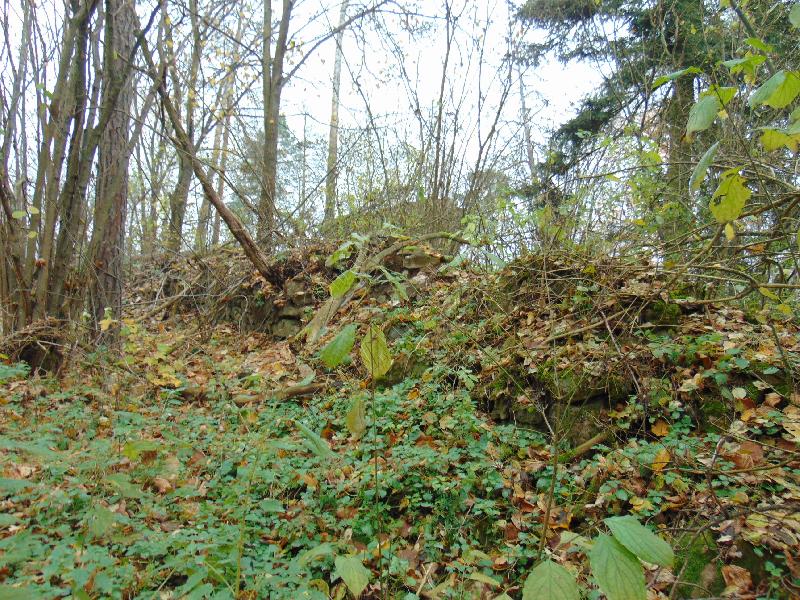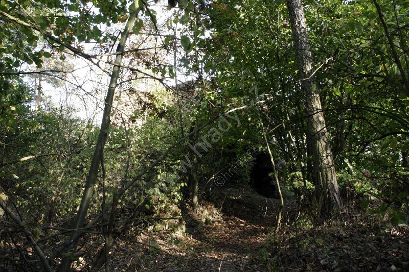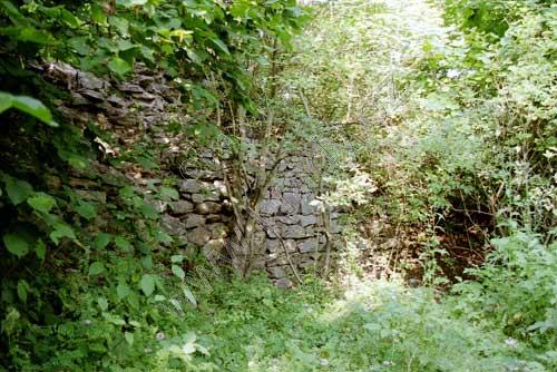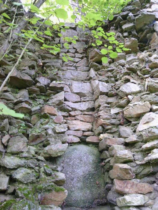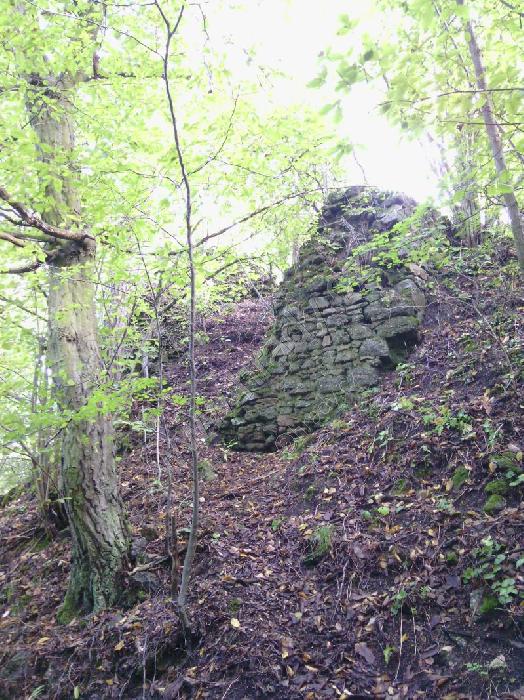 Úzký líc vnější hradby (pohled zvnějšku), který tvoří (tvořil) snad nějakou šachtu dosedající na skálu