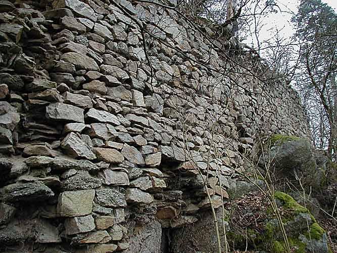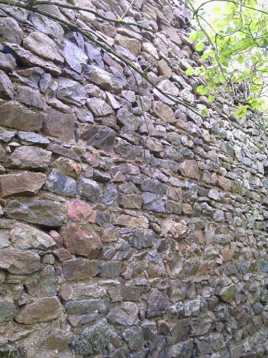 Detail zdění nároží hlavní hradby zvenčí, v horní části pouze k sobě přiložené kameny bez lepšího provázání, dole jsou patrné provazující kameny
