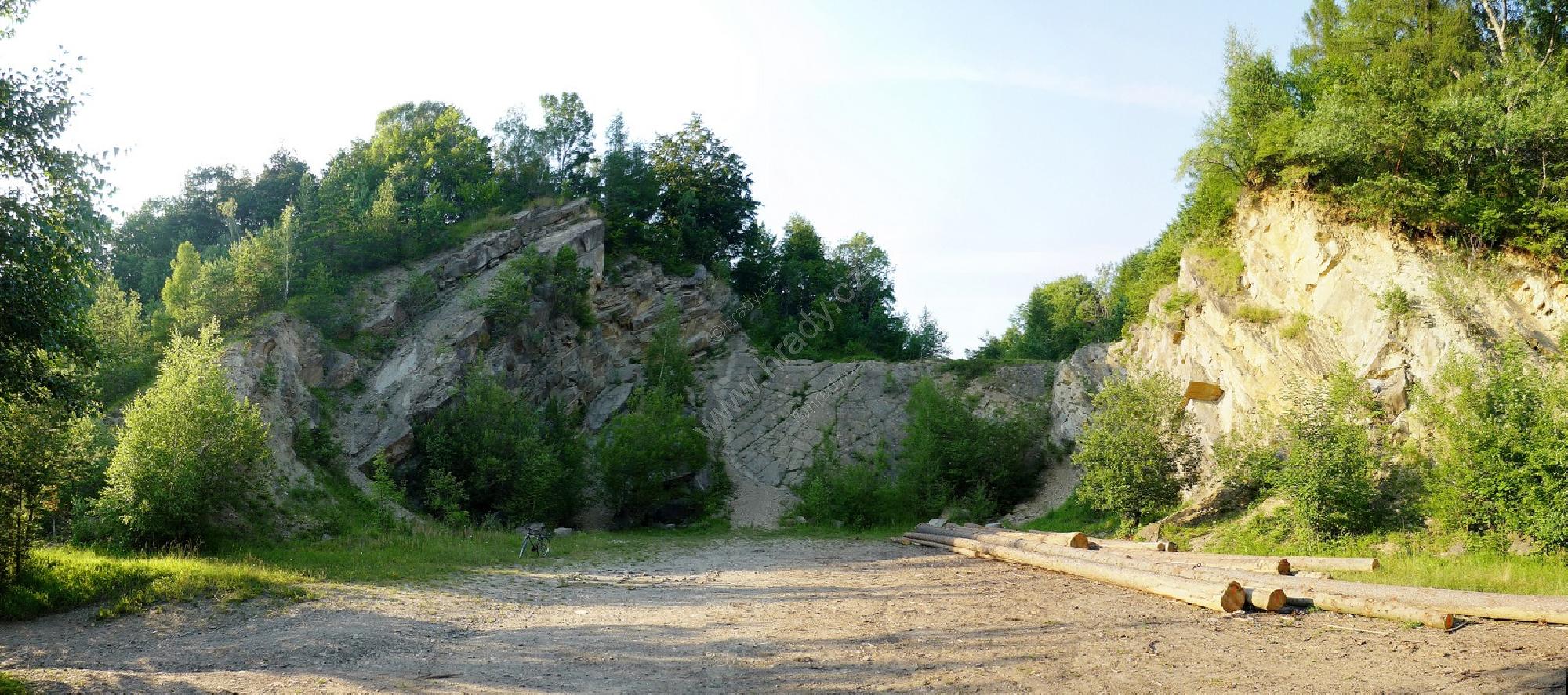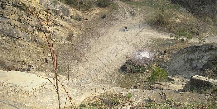 pohled z vrchu plochy hradiska na bývalý lom, který jej téměř pohltil