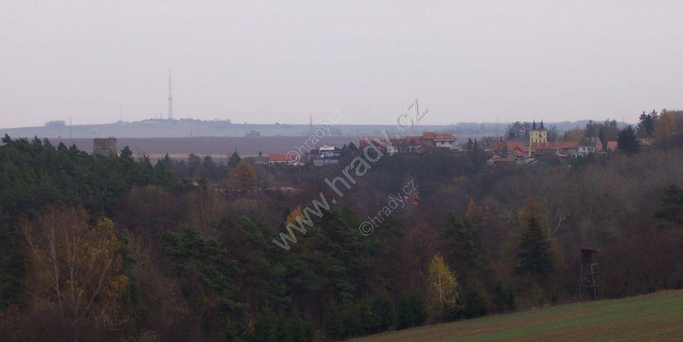 Pohled na Otaslavice od cesty na Obrovu nohu, vlevo Dolní hrad, uprostřed místo Horního hradu, vpravo kostel sv.Martina.