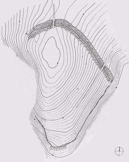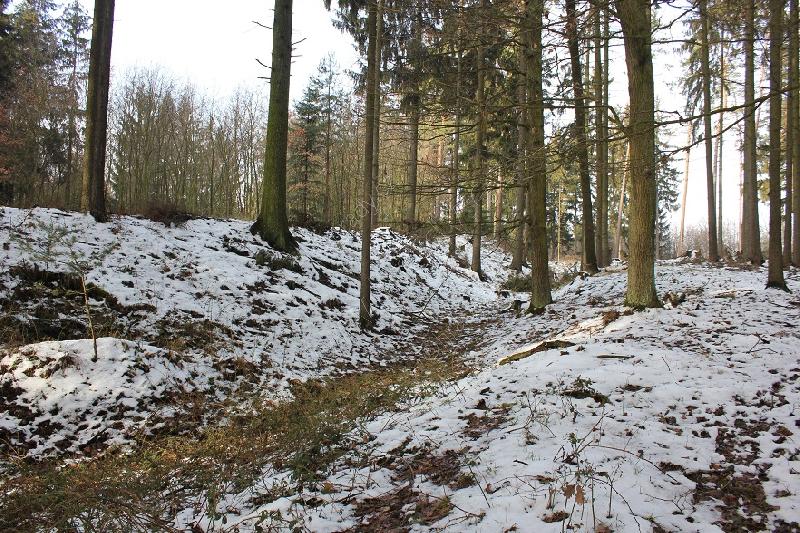 Dobře patrná val a příkop chránící ostožnu od severu.