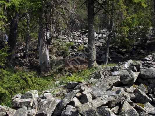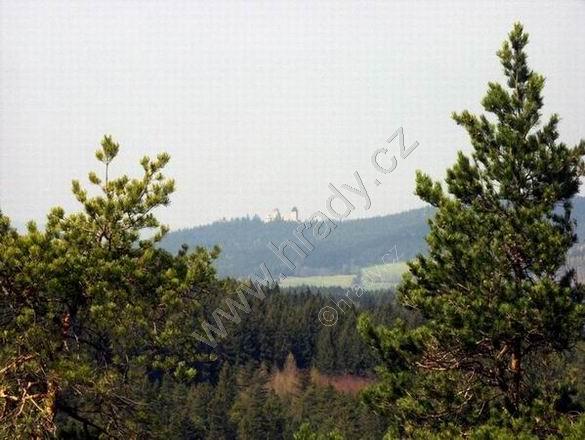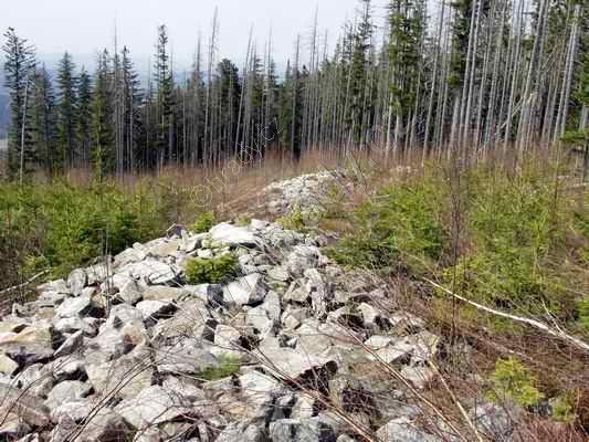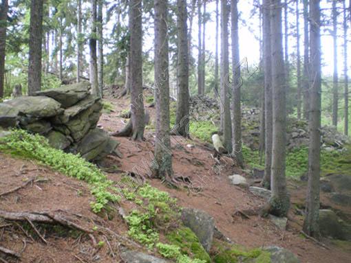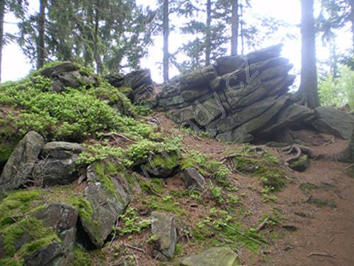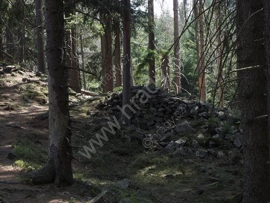 Pohled na jádro lokality s rozvalenou hradbou vpravo.