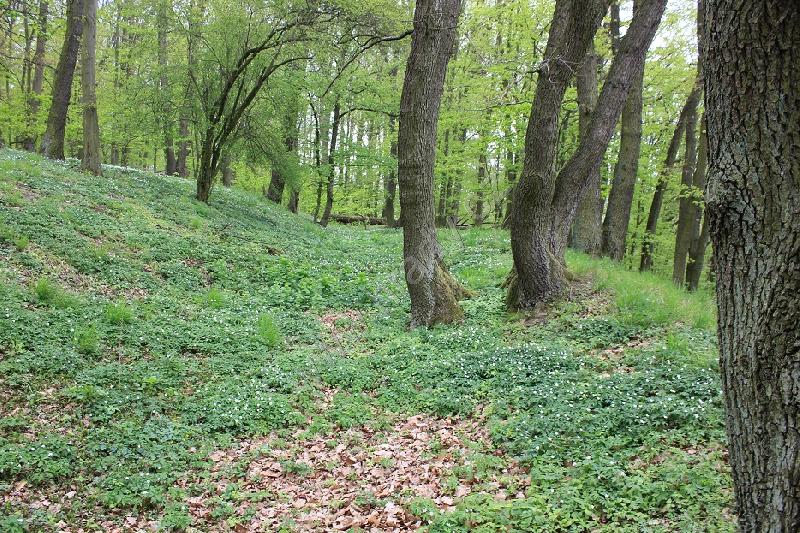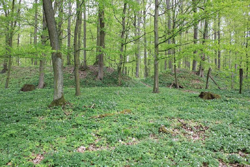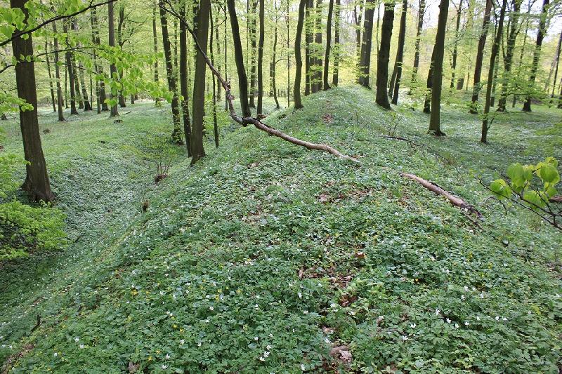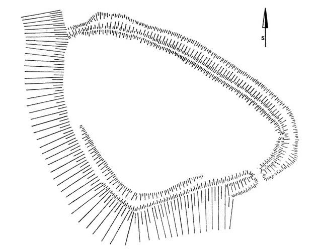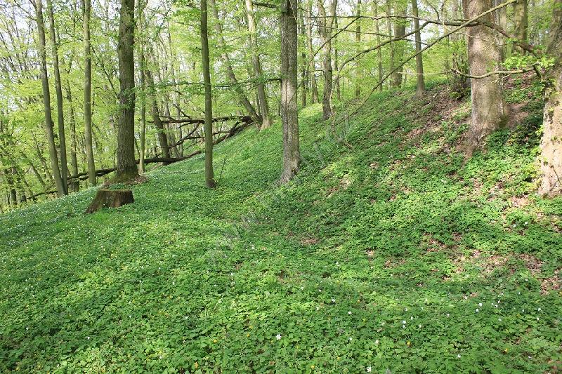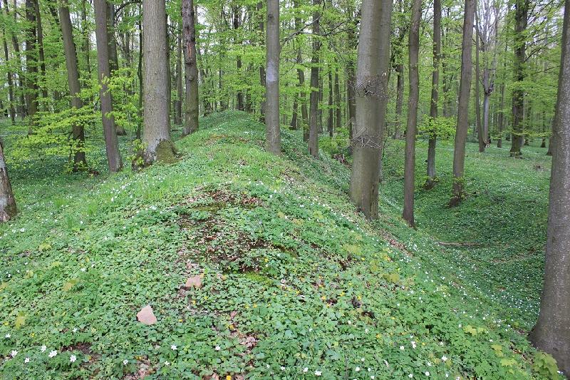 Velmi výrazný val a příkop na severovýchodní straně hradiště.
