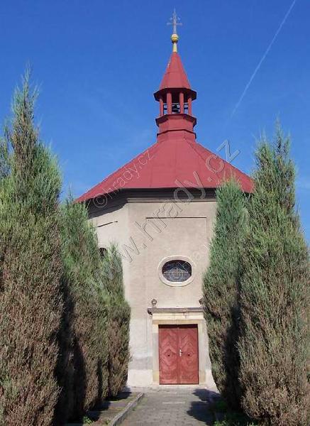 Pohled na hřbitovní kapli sv. Kříže na hřbitově v Kralicích na Hané.