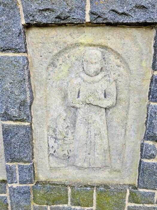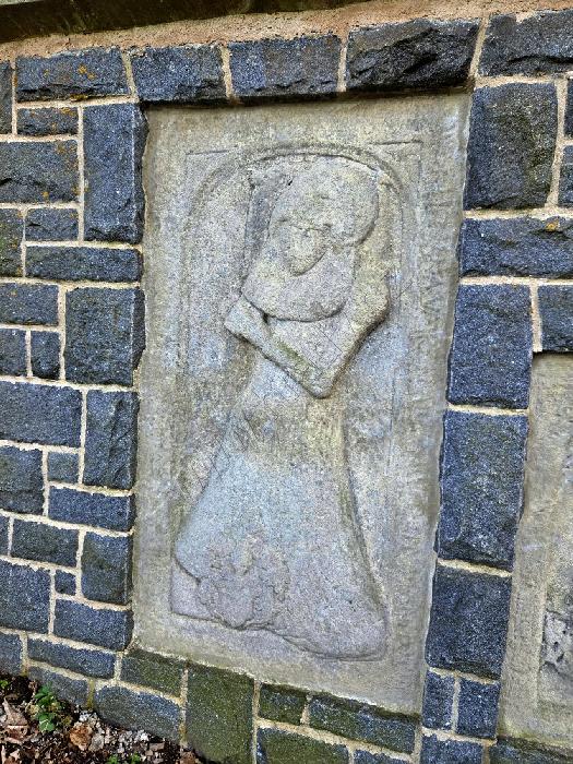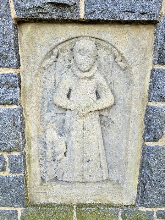 kmenná zeď s osazenými kamennými staršími náhrobky