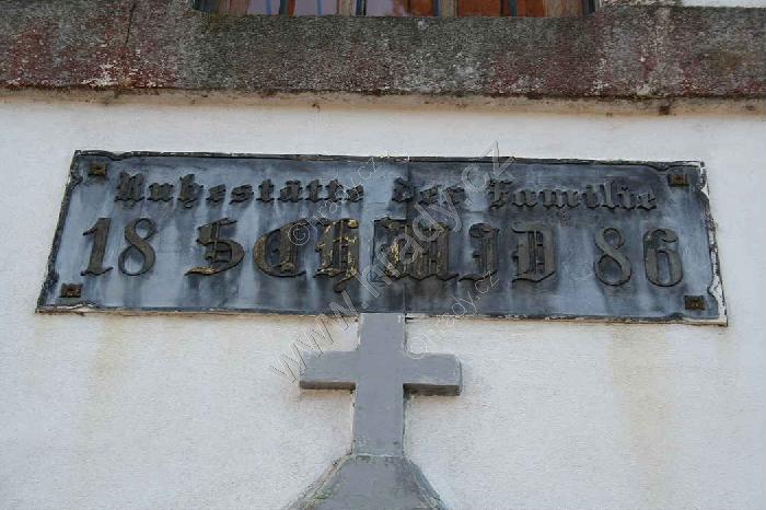 Litinová deska nad hlavním vchodem, český překlad: Hrobka rodiny Schmid, 1886