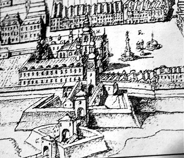 kostel s klášterem a Ratibořskou branou na kresbě města z r. 1689