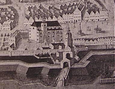 pohled od severu na Ratibořskou bránu a kostel s klášterem v 17. stol.