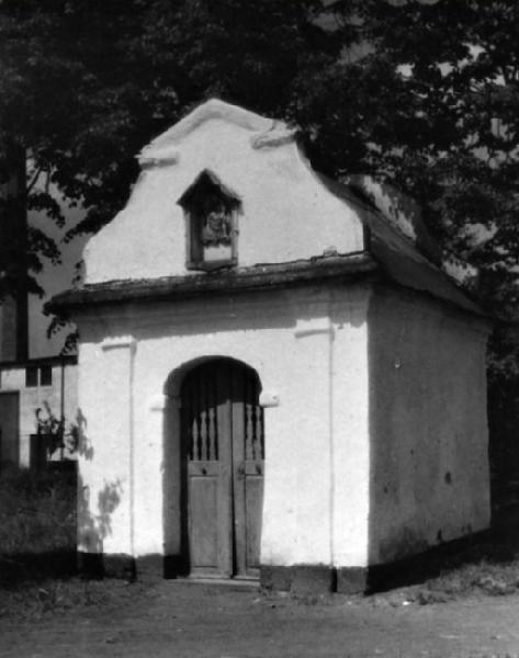 udržovaná kaple s historickou roubenou stodolou v pozadí, kolem r. 1928