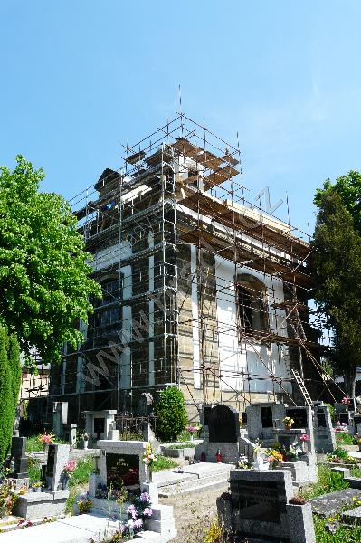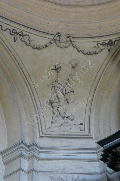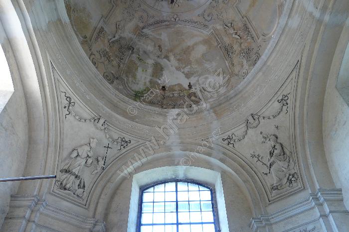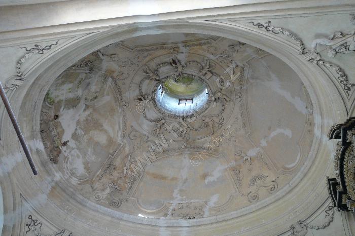 část kupole a pendantivy nad vchodem se sochami sv. Karla Boromejského a sv. Rozálie