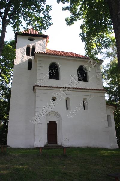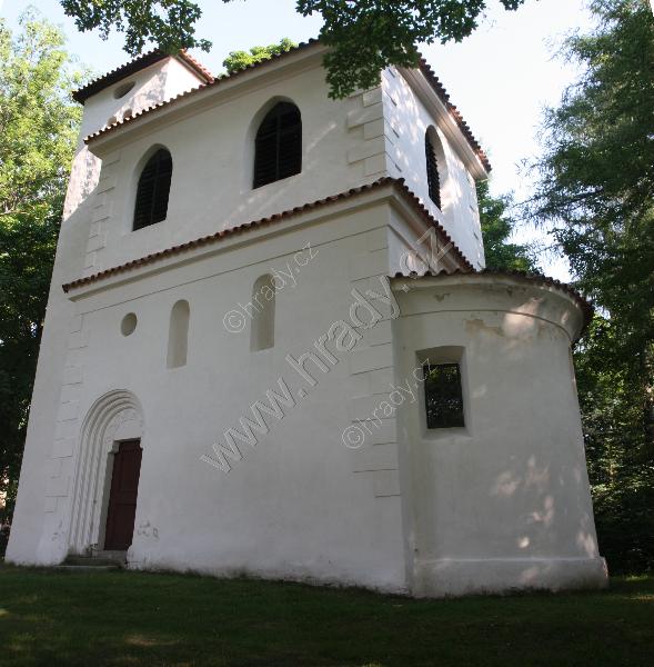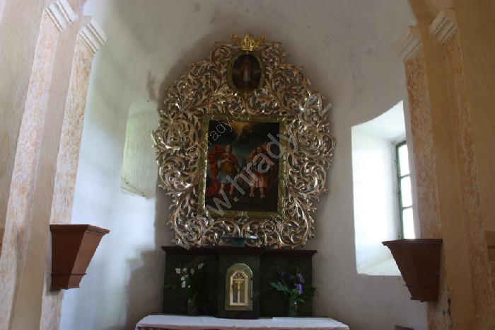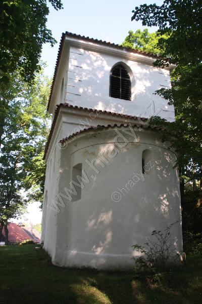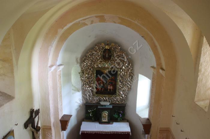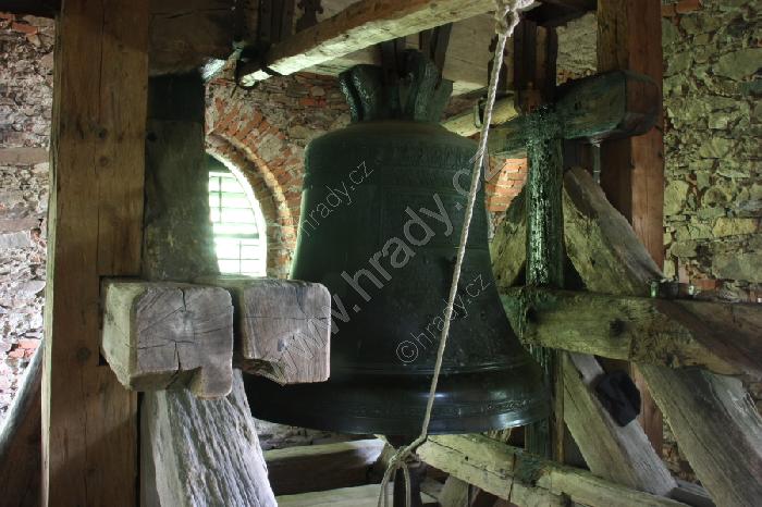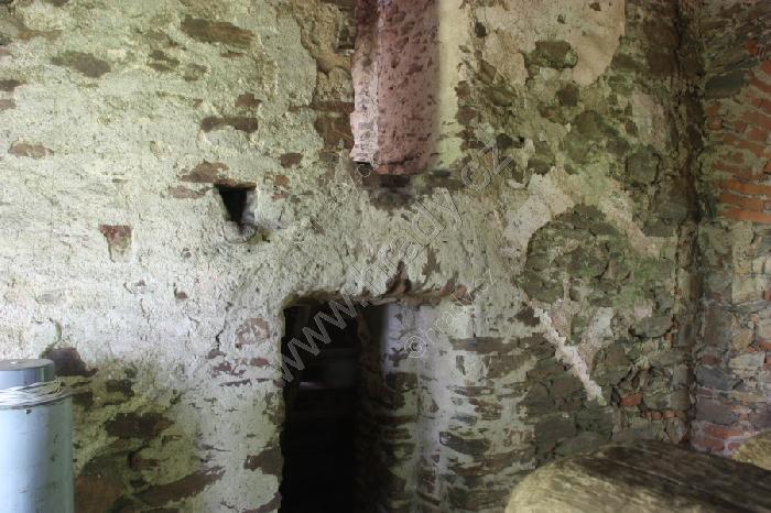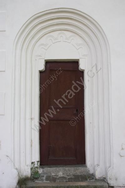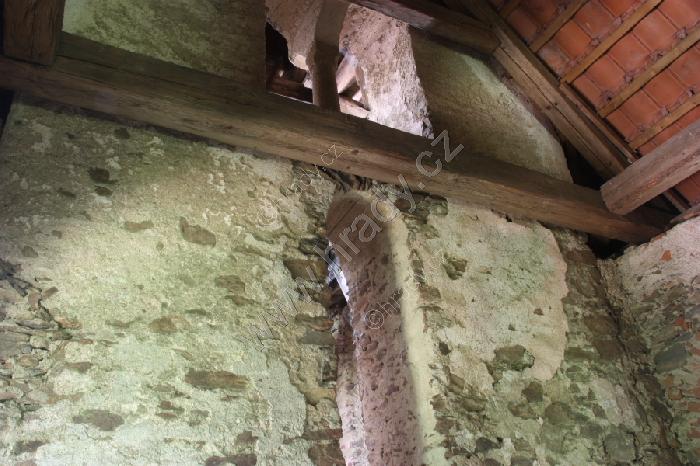 Vchod do zvonového patra nad lodí, vlevo nad ním původní odvodňovací žlábek, po stranách otisky původní střechy