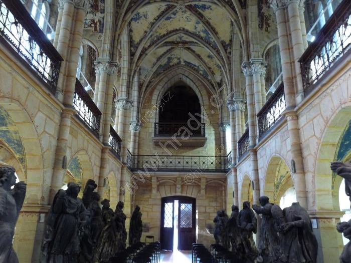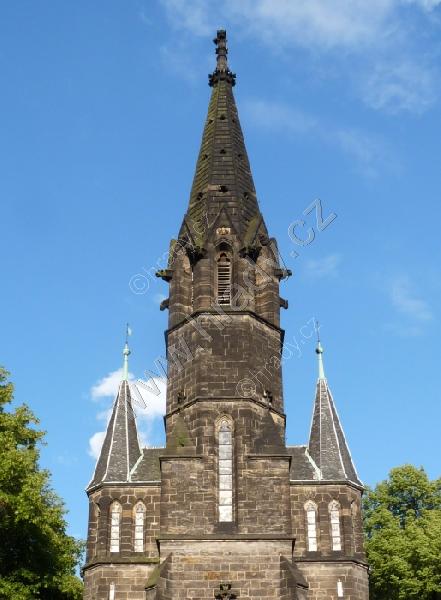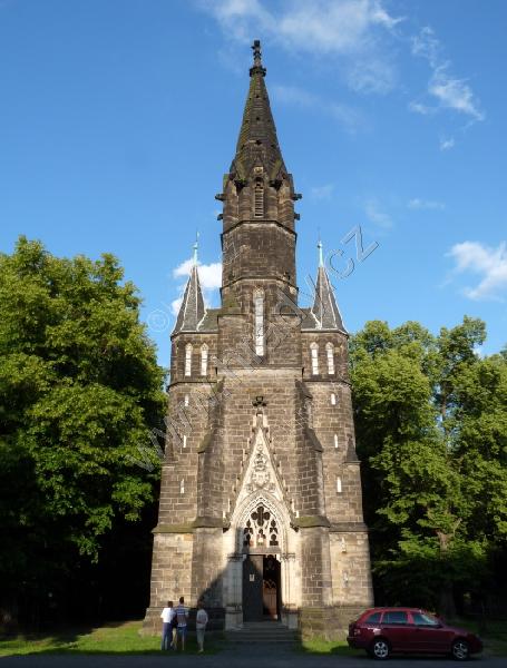 pohled na kapli s bývalým kostelníkovým domkem v zádech.