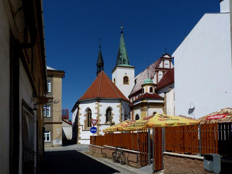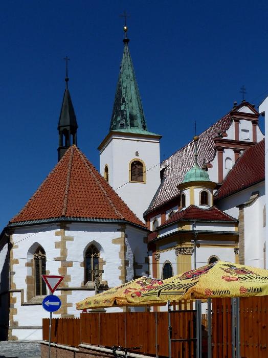 presbytář kaple, po pravé straně farní kostel