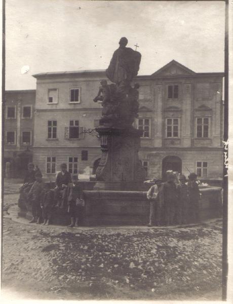 Fulnek - kašna sv.Sarkandra - foto z počátku 20.století (soukr.sbírka IvoR)